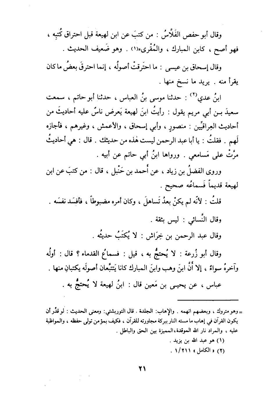 وَقَالَ أَبُو حَفْصٍ الفَلاَّسُ: مَنْ كَتَبَ عَنِ ابْنِ لَهِيْعَةَ قَبْلَ احْتِرَاقِ كُتُبِهِ، فَهُوَ أَصَحُّ، كَابْنِ المُبَارَكِ، وَالمُقْرِئِ (1) ، وَهُوَ ضَعِيْفُ الحَدِيْثِ.