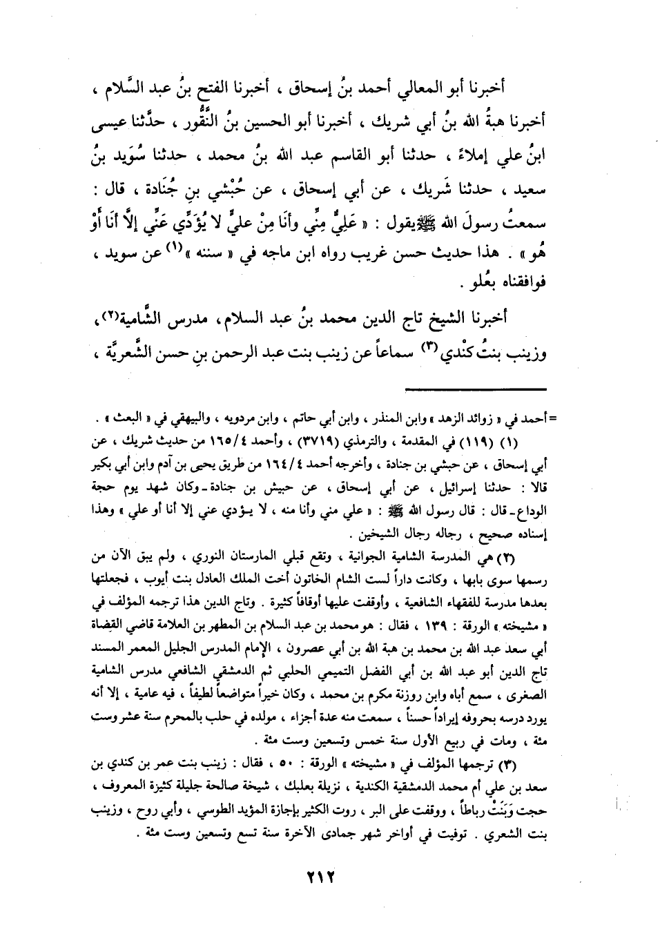 أَخْبَرَنَا الشَّيْخُ تَاجُ الدِّيْنِ مُحَمَّدُ بنُ عَبْدِ السَّلاَمِ مُدَرِّسُ الشَّامِيَّةِ (2) ، وَزَيْنَبُ بِنْتُ كِنْدِيٍّ (3) سَمَاعاً، عَنْ زَيْنَبَ بِنْتِ عَبْدِ الرَّحْمَنِ بنِ حَسَنٍ الشَّعْرِيَّةِ،