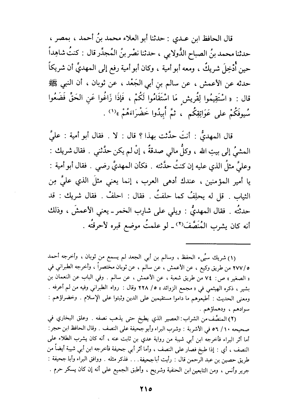كُنْتُ شَاهِداً حِيْنَ أُدْخِلَ شَرِيْكٌ، وَمَعَهُ أَبُو أُمَيَّةَ، وَكَانَ أَبُو أُمَيَّةَ رَفَعَ إِلَى المَهْدِيِّ: أَنَّ شَرِيْكاً حَدَّثَهُ عَنِ الأَعْمَشِ، عَنْ سَالِمِ بنِ أَبِي الجَعْدِ، عَنْ ثَوْبَانَ: