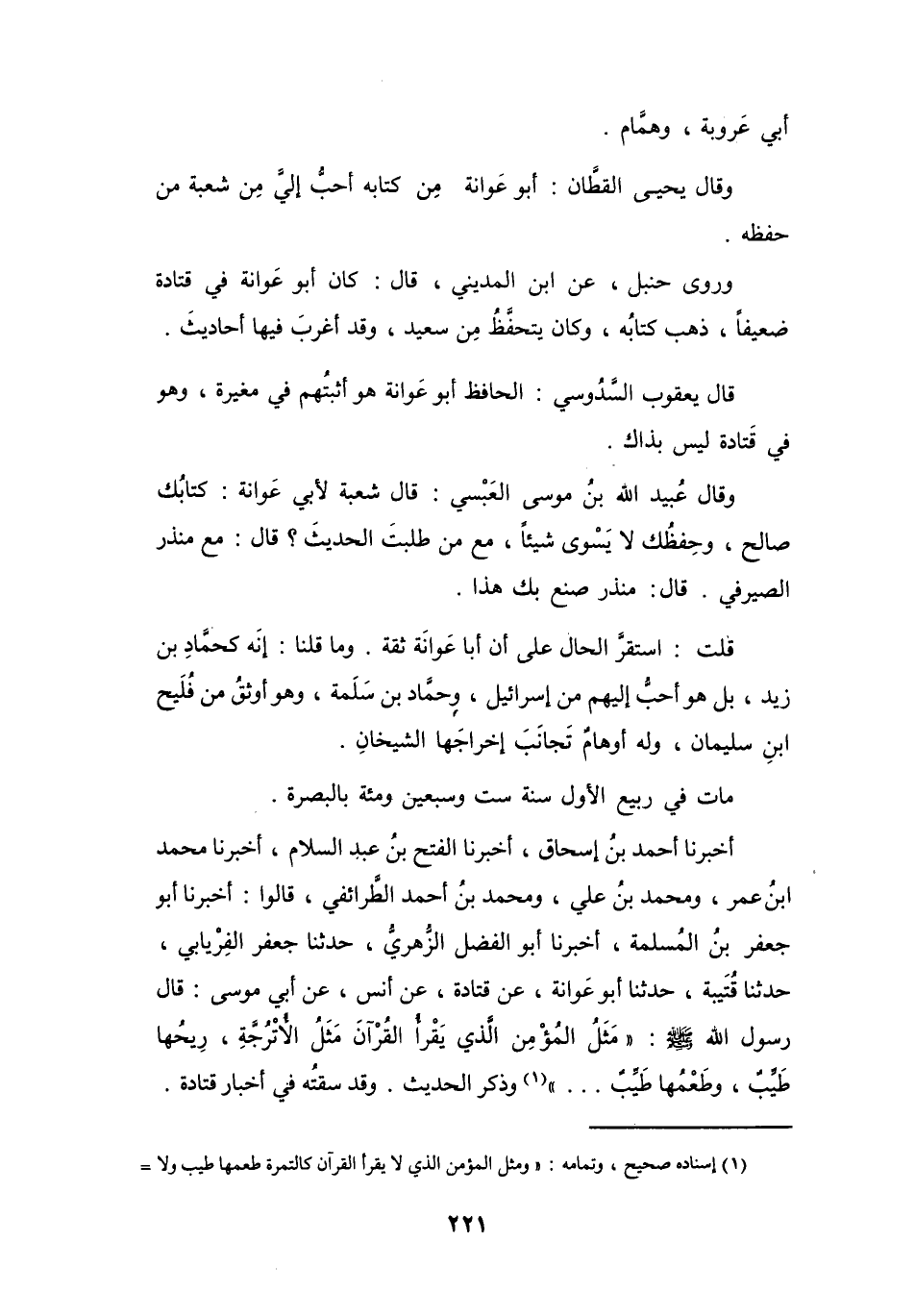 وَقَالَ يَحْيَى القَطَّانُ: أَبُو عَوَانَةَ مِنْ كِتَابِه أَحَبُّ إِلَيَّ مِنْ شُعْبَةَ مِنْ حِفْظِهِ.