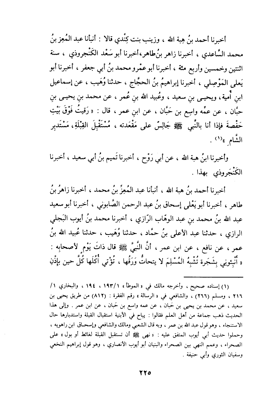 أَنْبَأَنَا عَبْدُ المُعِزِّ بنُ مُحَمَّدٍ السَّاعِدِيُّ، أَخْبَرَنَا زَاهِرُ بنُ طَاهِرٍ، أَخْبَرَنَا أَبُو سَعْدٍ الكَنْجَرُوْذِيُّ سَنَةَ اثْنَتَيْنِ وَخَمْسِيْنَ وَأَرْبَعِ مائَةٍ، أَخْبَرَنَا أَبُو عَمْرٍو مُحَمَّدُ بنُ أَبِي جَعْفَرٍ، أَخْبَرَنَا أَبُو يَعْلَى المَوْصِلِيُّ، أَخْبَرَنَا إِبْرَاهِيْمُ بنُ الحَجَّاجِ، حَدَّثَنَا وُهَيْبٌ، عَنْ إِسْمَاعِيْلَ بنِ أُمَيَّةَ، وَيَحْيَى بنِ سَعِيْدٍ، وَعُبَيْدِ اللهِ بنِ عُمَرَ، عَنْ مُحَمَّدِ بنِ يَحْيَى بنِ حَبَّانَ، عَنْ عَمِّهِ؛ وَاسِعِ بنِ حَبَّانَ، عَنِ ابْنِ عُمَرَ، قَالَ: