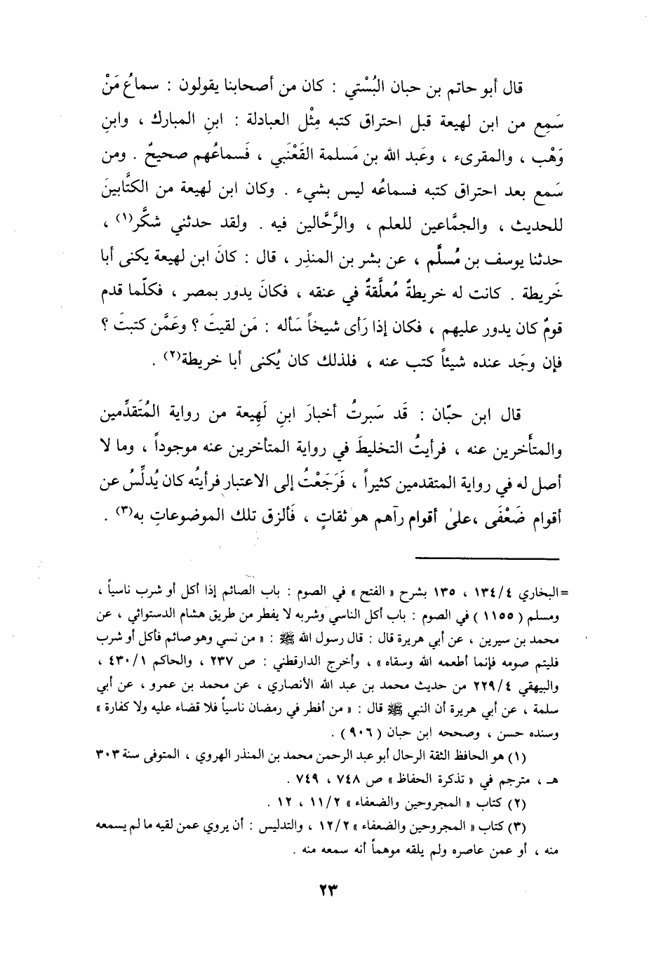 قَالَ ابْنُ حِبَّانَ: قَدْ سَبَرْتُ أَخْبَارَ ابْنِ لَهِيْعَةَ مِنْ رِوَايَةِ المُتَقَدِّمِيْنَ وَالمُتَأَخِّرِيْنَ عَنْهُ، فَرَأَيْتُ التَّخْلِيطَ فِي رِوَايَةِ المُتَأَخِّرِيْنَ عَنْهُ مَوْجُوْداً، وَمَا لاَ أَصْلَ لَهُ فِي رِوَايَةِ المُتَقَدِّمِيْنَ كَثِيْراً، فَرَجَعتُ إِلَى الاعْتِبَارِ، فَرَأَيْتُهُ كَانَ يُدَلِّسُ عَنْ أَقْوَامٍ ضَعْفَى، عَلَى أَقْوَامٍ رَآهُم هُوَ ثِقَاتٍ، فَأَلزَقَ تِلْكَ المَوْضُوعَاتِ بِهِ (3) .
