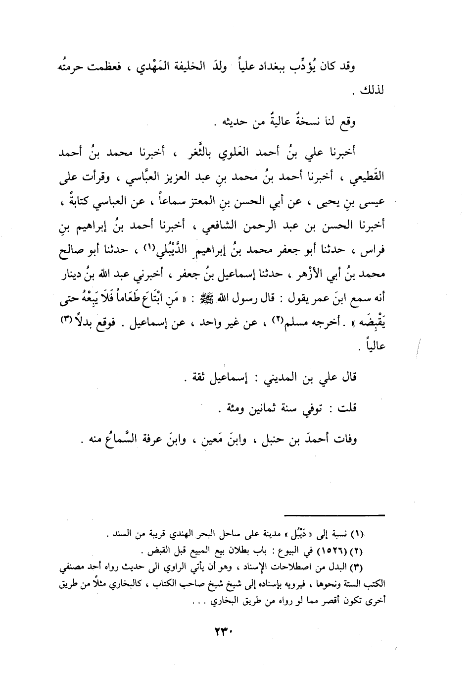 أَخْبَرَنَا عَلِيُّ بنُ أَحْمَدَ العَلَوِيُّ بِالثَّغْرِ، أَخْبَرَنَا مُحَمَّدُ بنُ أَحْمَدَ القَطِيْعِيُّ، أَخْبَرَنَا أَحْمَدُ بنُ مُحَمَّدِ بنِ عَبْدِ العَزِيْزِ العَبَّاسِيُّ، وَقَرَأتُ عَلَى عِيْسَى بنِ يَحْيَى، عَنْ أَبِي الحَسَنِ بنِ المُعْتَزِّ سَمَاعاً، عَنِ العَبَّاسِيِّ كِتَابَةً، أَخْبَرَنَا الحَسَنُ بنُ عَبْدِ الرَّحْمَنِ الشَّافِعِيُّ، أَخْبَرَنَا أَحْمَدُ بنُ إِبْرَاهِيْمَ بنِ فِرَاسٍ، حَدَّثَنَا أَبُو جَعْفَرٍ مُحَمَّدُ بنُ إِبْرَاهِيْمَ الدَّيْبُلِيُّ (1) ، حَدَّثَنَا أَبُو صَالِحٍ مُحَمَّدُ بنُ أَبِي الأَزْهَرِ، حَدَّثَنَا إِسْمَاعِيْلُ بنُ جَعْفَرٍ، أَخْبَرَنِي عَبْدُ اللهِ بنُ دِيْنَارٍ، أَنَّهُ سَمِعَ ابْنَ عُمَرَ يَقُوْلُ: