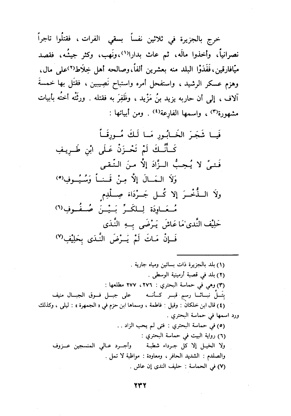 فَيَا شَجَرَ الخَابُوْرِ مَا لَكَ مُوْرِقاً؟ ... كَأَنَّكَ لَمْ تَحْزَنْ عَلَى ابْنِ طَرِيْفِ!