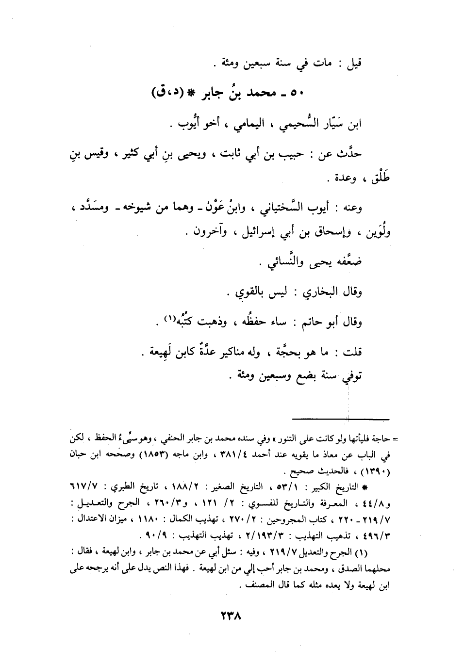 (1) الجرح والتعديل 7 / 219، وفيه: سئل أبي عن محمد بن جابر، وابن لهيعة، فقال: محلهما الصدق، ومحمد بن جابر أحب إلي من ابن لهيعة.