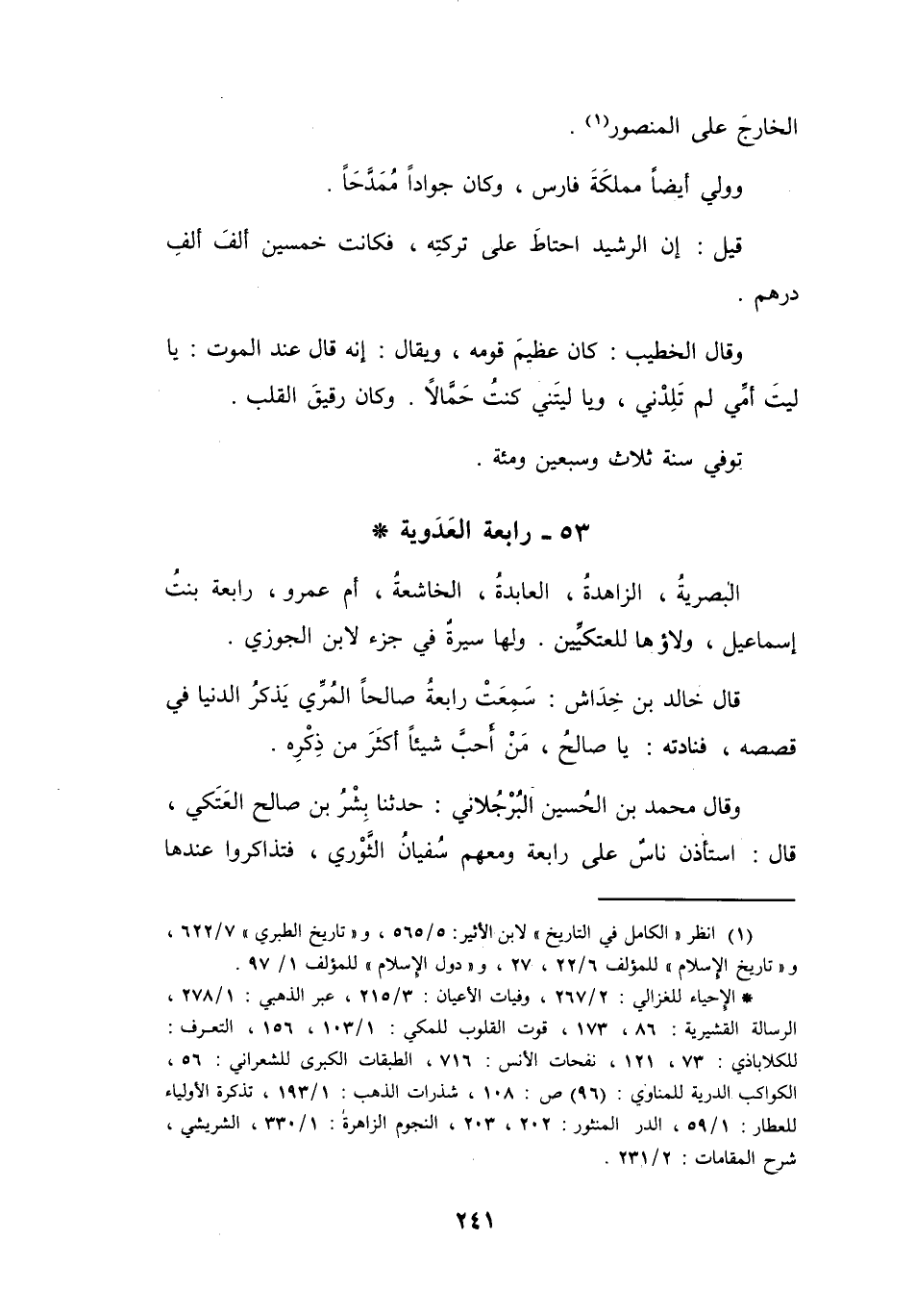 (*) الاحياء للغزالي: 2 / 267، وفيات الأعيان: 3 / 215، عبر الذهبي: 1 / 278، الرسالة القشيرية: 86، 173، قوت القلوب للمكي: 1 / 103، 156، التعرف: للكلاباذي: 73، 121، نفحات الانس: 716، الطبقات الكبرى للشعراني: 56، الكواكب الدرية للمناوي: (96) ص: 108، شذرات الذهب: 1 / 193، تذكرة الأولياء للعطار: 1 / 59، الدر المنثور: 202، 203، النجوم الزاهرة: 1 / 330، الشريشي، شرح المقامات: 2 / 231.