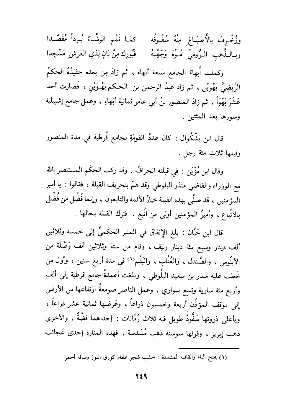 قَالَ ابْنُ حَيَّانَ: بَلَغَ الإِنفَاقُ فِي المِنْبَرِ الحَكَمِيِّ إِلَى خَمْسَةٍ وَثَلاَثِيْنَ أَلْفَ دِيْنَارٍ وَسَبْعِ مائَةِ دِيْنَارٍ وَنَيِّفٍ، وَقَامَ مِنْ سِتَّةٍ وَثَلاَثِيْنَ أَلْفَ وَصْلَةٍ مِنَ الأَبْنُوْسِ، وَالصَّنْدَلِ، وَالعُنَّابِ، وَالبَقَّمِ (1) فِي مُدَّةِ أَرْبَعِ سِنِيْنَ، وَأَوَّلُ مَنْ خَطَبَ عَلَيْهِ مُنْذِرُ بنُ سَعِيْدٍ البَلُّوْطِيُّ، وَبَلَغَتْ أَعمِدَةُ جَامِعِ قُرْطُبَةَ إِلَى أَلْفٍ وَأَرْبَعِ مائَةِ سَارِيَةٍ وَتِسْعِ سَوَارِيَ، وَعَمِلَ النَّاصِرُ صَوْمَعَةً ارْتِفَاعُهَا مِنَ الأَرْضِ إِلَى مَوْقِفِ المُؤَذِّنِ أَرْبَعَةٌ وَخَمْسُوْنَ ذِرَاعاً، وَعَرضُهَا ثَمَانِيَةَ عَشَرَ ذِرَاعاً، وَبَأَعْلَى ذِرْوَتِهَا سَفُّوْدٌ طَوِيْلٌ فِيْهِ ثَلاَثُ رُمَّانَاتٍ: إِحْدَاهُمَا فِضَّةٌ، وَالأُخْرَى ذَهَبُ إِبرِيْزَ، وَفَوْقَهَا سَوْسَنَةٌ ذَهَبٌ مُسَدَّسَةٌ، فَهَذِهِ المَنَارَةُ إِحْدَى عَجَائِبِ
