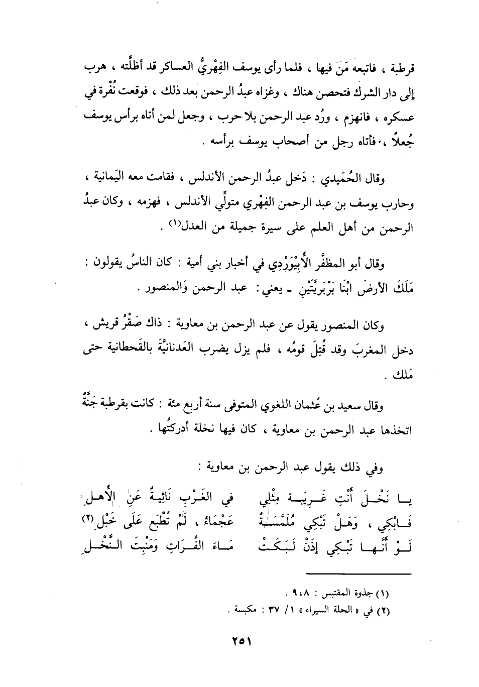 وَقَالَ الحُمَيْدِيُّ: دَخَلَ عَبْدُ الرَّحْمَنِ الأَنْدَلُسَ، فَقَامَت مَعَهُ اليَمَانِيَّةُ، وَحَارَبَ يُوْسُفَ بنَ عَبْدِ الرَّحْمَنِ الفِهْرِيَّ مُتَوَلِّي الأَنْدَلُسَ، فَهَزَمَه، وَكَانَ عَبْدُ الرَّحْمَنِ مِنْ أَهْلِ العِلْمِ عَلَى سِيْرَةٍ جَمِيْلَةٍ مِنَ العَدْلِ (1) .