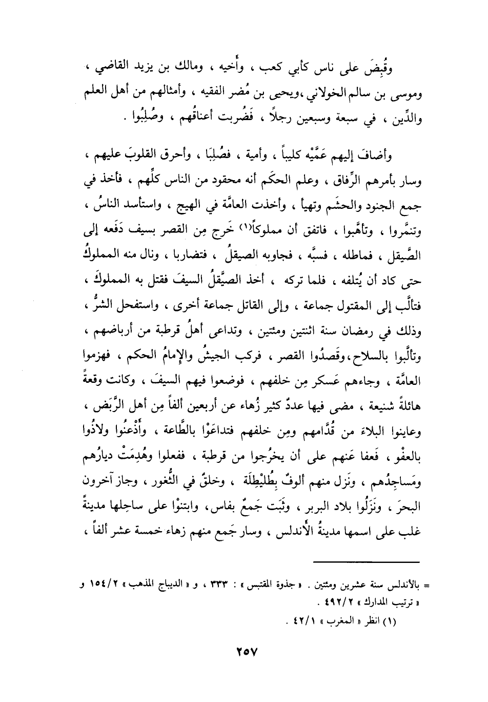 وَقُبِضَ عَلَى نَاسٍ كَأَبِي كَعْبٍ، وَأَخِيْهِ، وَمَالِكِ بنِ يَزِيْدَ القَاضِي، وَمُوْسَى بنِ سَالِمٍ الخَوْلاَنِيِّ، وَيَحْيَى بنِ مُضَرَ الفَقِيْهِ، وَأَمْثَالِهِم مِنْ أَهْلِ العِلْمِ وَالدِّيْنِ، فِي سَبْعَةٍ وَسَبْعِيْنَ رَجُلاً، فَضُرِبَتْ أَعْنَاقُهُم، وَصُلِبُوا.
