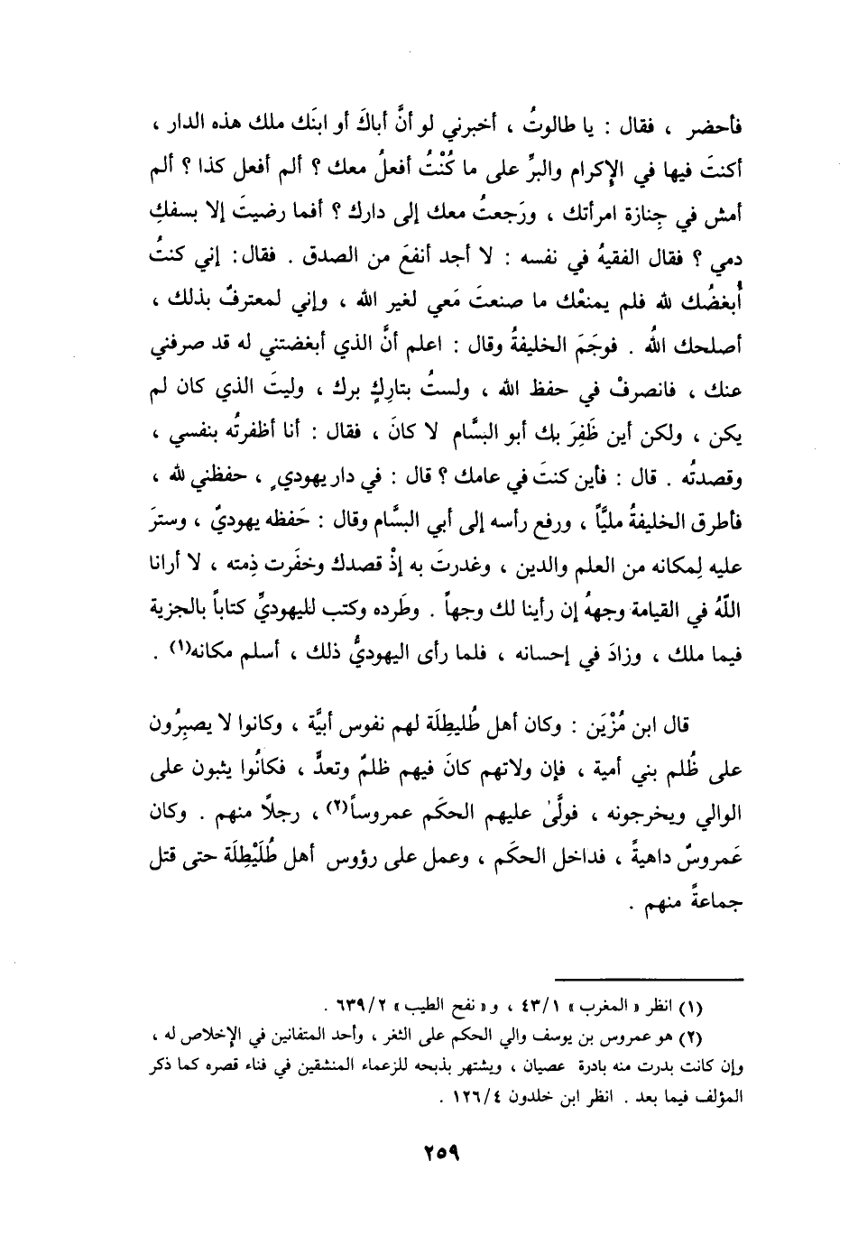 فَأَطْرَقَ الخَلِيْفَةُ مَلِيّاً، وَرَفَعَ رَأْسَهُ إِلَى أَبِي البَسَّامِ، وَقَالَ: حَفِظَه يَهُوْدِيٌّ، وَسَتَرَ عَلَيْهِ لِمَكَانِه مِنَ العِلْمِ وَالدِّيْنِ، وَغَدَرْتَ بِهِ إِذْ قَصَدَكَ، وَخَفَرْتَ ذِمَّتهُ، لاَ أَرَانَا اللهُ فِي القِيَامَةِ وَجْهَهُ إِنْ رَأَيْنَا لَكَ وَجْهاً.