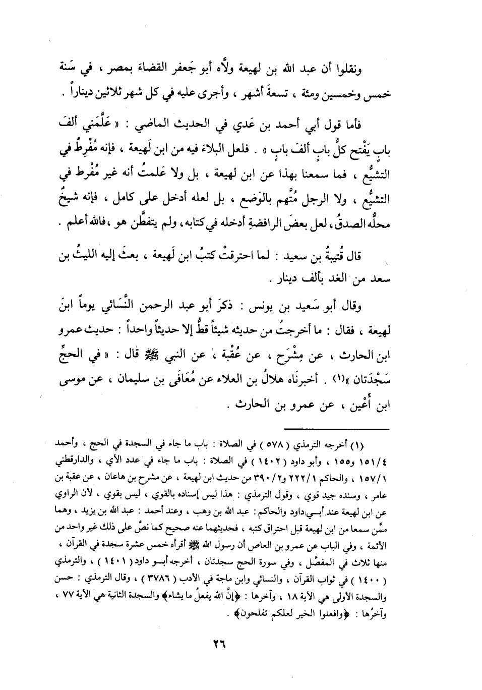 (1) أخرجه الترمذي (578) في الصلاة: باب ما جاء في السجدة في الحج، وأحمد 4 / 151 و155، وأبو داود (1402) في الصلاة: باب ما جاء في عدد الآي، والدارقطني 1 / 157، والحاكم 1 / 222 و2 / 390 من حديث ابن لهيعة، عن مشرح بن هاعان، عن عقبة بن عامر، وسنده جيد قوي، وقول الترمذي: هذا ليس إسناده بالقوي، ليس بقوي، لان الراوي عن ابن لهيعة عند أبي داود والحاكم: عبد الله بن وهب، وعند أحمد: عبد الله بن يزيد، وهما ممن سمعا من ابن لهيعة قبل احتراق كتبه، فحديثهما عنه صحيح كما نص على ذلك غير واحد من الأئمة، وفي الباب عن عمرو بن العاص أن رسول الله صلى الله عليه وسلم أقرأه خمس عشرة سجدة في القرآن، منها ثلاث في المفصل، وفي سورة الحج سجدتان، أخرجه أبو داود (1401) ، والترمذي (1400) في ثواب القرآن، والنسائي وابن ماجة في الأدب (3786) ، وقال الترمذي: حسن والسجدة الأولى هي الآية 18، وآخرها: (إن الله يفعل ما يشاء) والسجدة الثانية هي الآية 77، وآخرها: (وافعلوا الخير لعلكم تفلحون) .