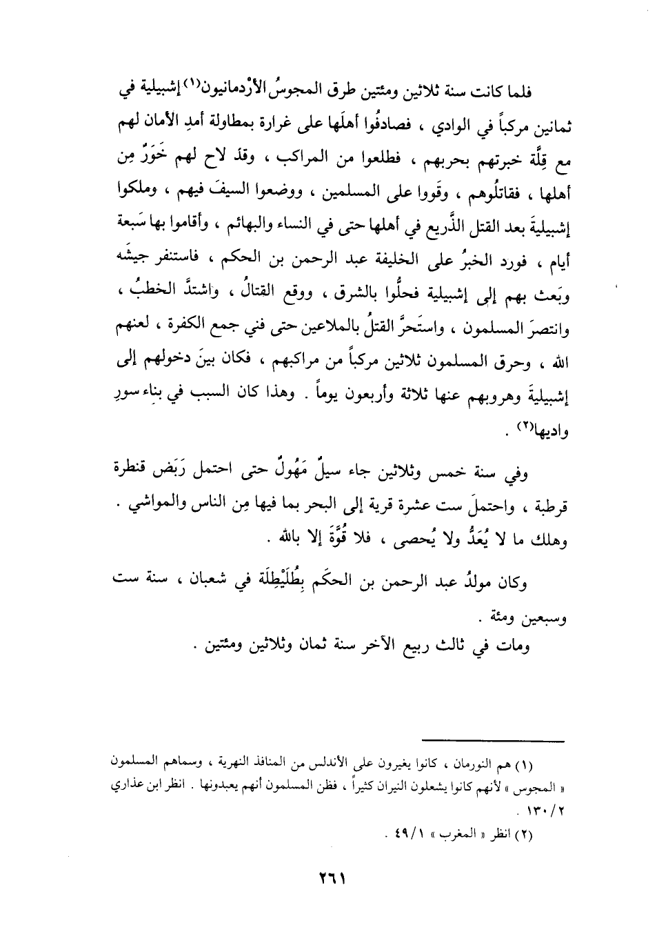 فَلَمَّا كَانَتْ سَنَةُ ثَلاَثِيْنَ وَمَائَتَيْنِ، طَرَقَ المَجُوْسُ الأَرْدَمَانِيُّوْنَ (1) إِشْبِيْلِيَةَ فِي ثَمَانِيْنَ مَرْكَباً فِي الوَادِي، فَصَادَفُوا أَهْلَهَا عَلَى غِرَارَةٍ بِمُطَاولَةِ أَمَدِ الأَمَانِ لَهُم مَعَ قِلَّةِ خِبْرَتِهِم بِحَرْبِهِم، فَطَلَعُوا مِنَ المَرَاكِبِ، وَقَدْ لاَحَ لَهُم خَوَرٌ مِنْ أَهْلِهَا، فَقَاتَلُوْهُم، وَقَوَوْا عَلَى المُسْلِمِيْنَ، وَوَضَعُوا السَّيْفَ فِيْهِم، وَمَلَكُوا إِشْبِيْلِيَةَ بَعْدَ القَتْلِ الذَّرِيْعِ فِي أَهْلِهَا حَتَّى فِي النِّسَاءِ وَالبَهَائِمِ، وَأَقَامُوا بِهَا سَبْعَةَ أَيَّامٍ، فَوَرَدَ الخَبَرُ عَلَى الخَلِيْفَةِ عَبْدِ الرَّحْمَنِ بنِ الحَكَمِ، فَاسْتَنْفَرَ جَيْشَهُ، وَبَعَثَ بِهِم إِلَى إِشْبِيْلِيَةَ، فَحَلُّوا بِالشَّرْقِ، وَوَقَعَ القِتَالُ، وَاشْتَدَّ الخَطْبُ، وَانْتَصَرَ المُسْلِمُوْنَ، وَاسْتَحَرَّ القَتْلُ بِالمَلاَعِيْنِ حَتَّى فَنِيَ جَمْعُ الكَفَرَةِ - لَعَنَهُمُ اللهُ - وَحَرَقَ المُسْلِمُوْنَ ثَلاَثِيْنَ مَرْكَباً مِنْ مَرَاكِبِهِم، فَكَانَ بَيْنَ دُخُوْلِهِم إِلَى إِشْبِيْلِيَةَ وَهُرُوْبِهِم عَنْهَا ثَلاَثَةٌ وَأَرْبَعُوْنَ يَوْماً.