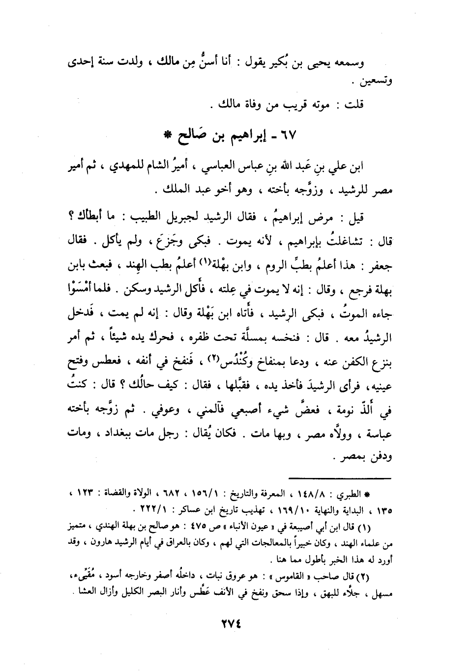 (1) قال ابن أبي أصيبعة في " عيون الانباء " ص 475: هو صالح بن بهلة الهندي، متميز من علماء الهند، وكان خبيرا بالمعالجات التي لهم، وكان بالعراق في أيام الرشيد هارون، وقد أورد له هذا الخبر بأطول مما هنا.