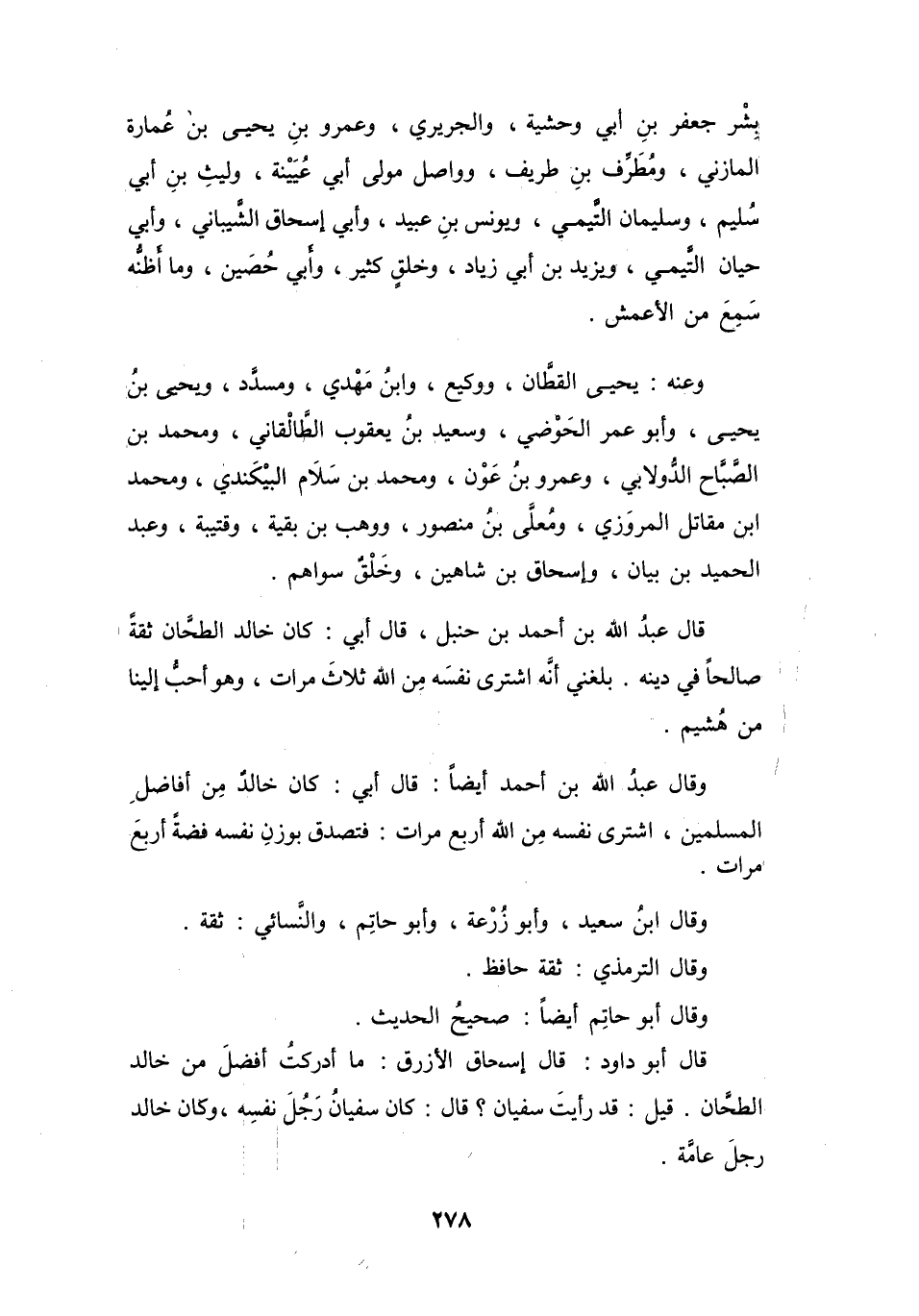 قَالَ عَبْدُ اللهِ بنُ أَحْمَدَ بنِ حَنْبَلٍ: قَالَ أَبِي: كَانَ خَالِدٌ الطَّحَّانُ ثِقَةً، صَالِحاً فِي دِيْنِهِ، بَلَغَنِي أَنَّهُ اشْتَرَى نَفْسَهُ مِنَ اللهِ ثَلاَثَ مَرَّاتٍ، وَهُوَ أَحَبُّ إِلَيْنَا مِنْ هُشَيْمٍ.