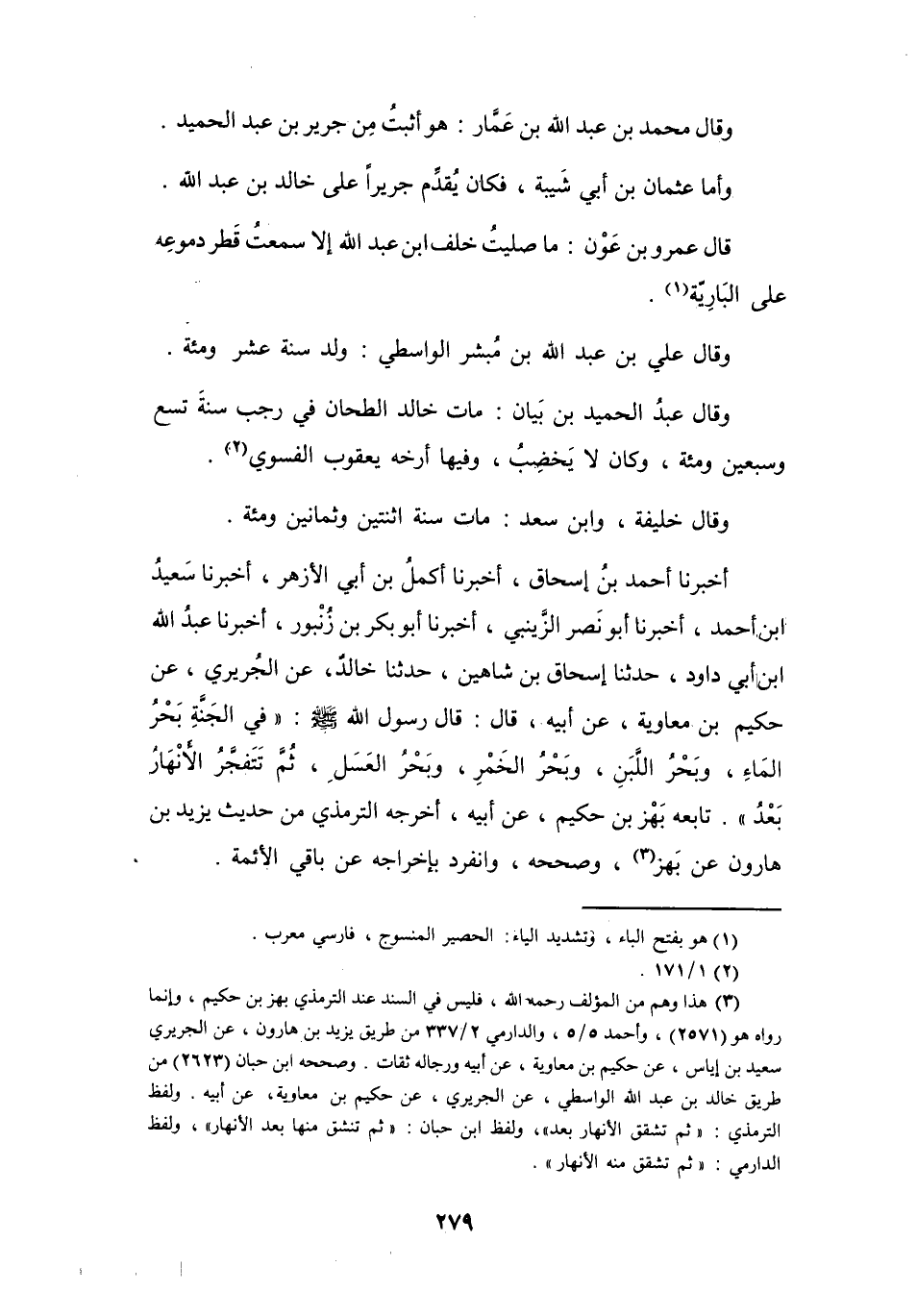 (3) هذا وهم من المؤلف رحمه الله، فليس في السند عند الترمذي بهز بن حكيم، وإنما رواه هو (2571) ، وأحمد 5 / 5، والدارمي 2 / 337 من طريق يزيد بن هارون، عن الجريري سعيد بن إياس، عن حكيم بن معاوية، عن أبيه ورجاله ثقات.
