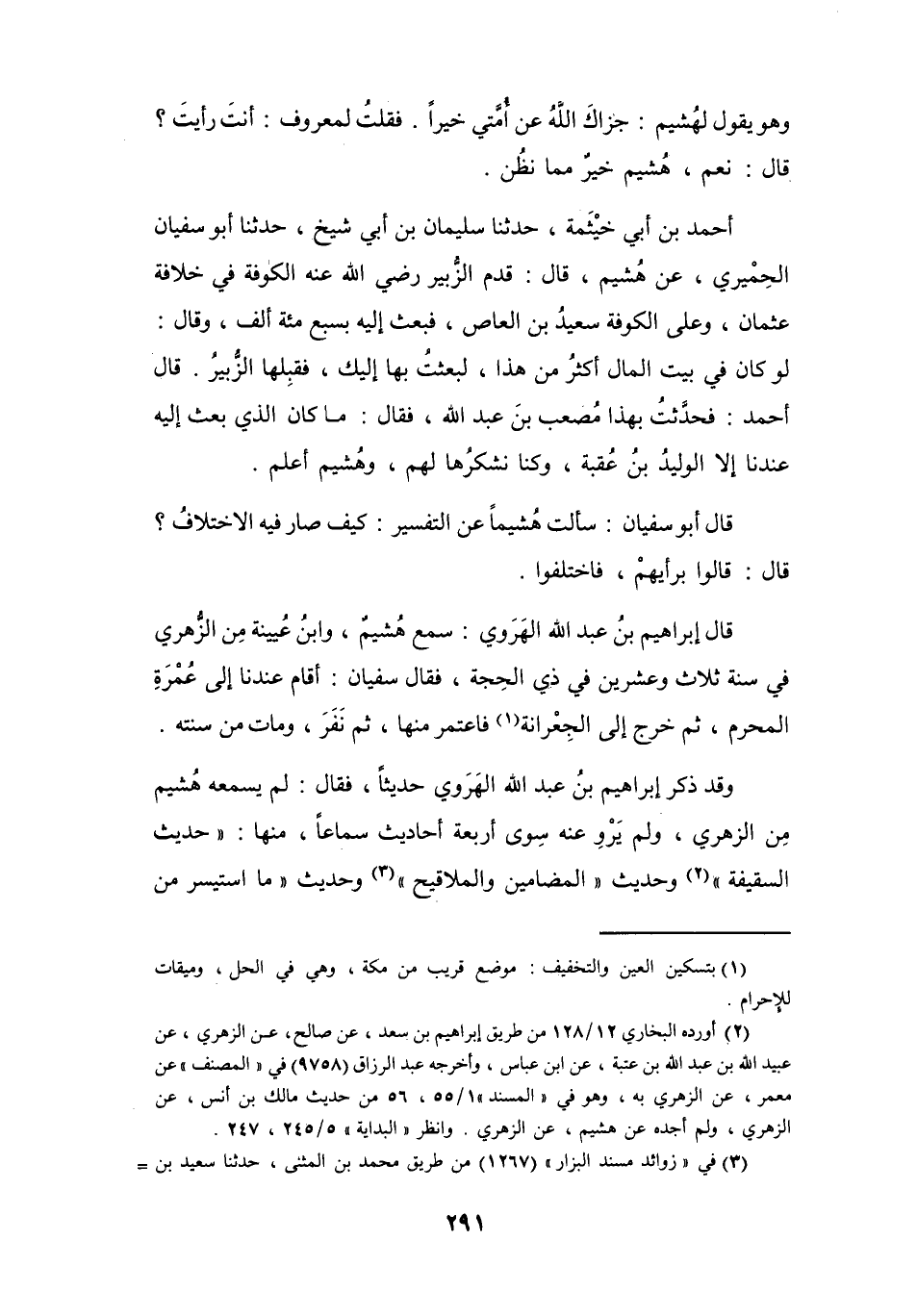 وَقَدْ ذَكَرَ إِبْرَاهِيْمُ بنُ عَبْدِ اللهِ الهَرَوِيُّ حَدِيْثاً، فَقَالَ: لَمْ يَسْمَعْهُ هُشَيْمٌ مِنَ الزُّهْرِيِّ، وَلَمْ يَروِ عَنْهُ سِوَى أَرْبَعَةَ أَحَادِيْثَ سَمَاعاً، مِنْهَا: حَدِيْثُ (السَّقِيْفَةِ (2)) ، وَحَدِيْثُ (المضَامِيْنَ وَالملاَقِيحَ (3)) ، وَحَدِيْثُ (مَا اسْتَيْسَرَ مِنَ
