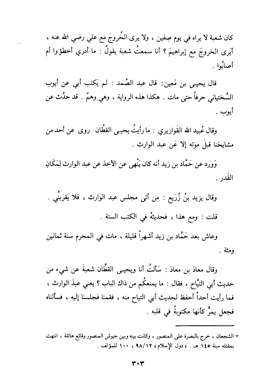 كَانَ شُعْبَةُ لاَ يَرَاهُ فِي يَوْمِ صِفِّيْنَ، وَلاَ يَرَى الخُرُوْجَ مَعَ عَلِيٍّ -رَضِيَ اللهُ عَنْهُ- أَيَرَى الخُرُوْجَ مَعَ إِبْرَاهِيْمَ؟ أَنَا سَمِعْتُ شُعْبَةَ يَقُوْلُ: مَا أَدْرِي أَخطؤُوا أَمْ أَصَابُوا.