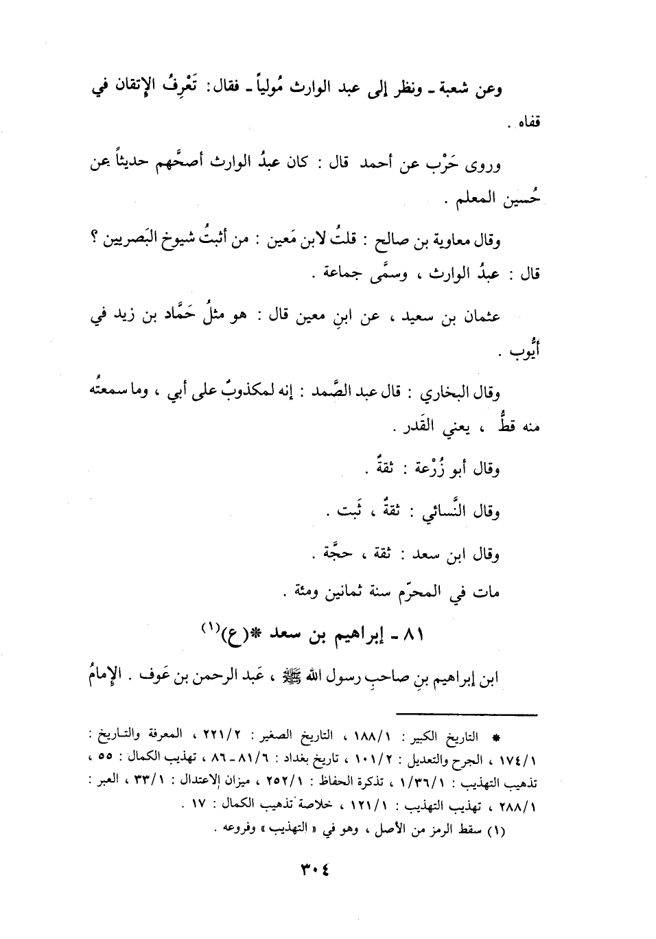 (*) التاريخ الكبير: 1 / 188، التاريخ الصغير: 2 / 221، المعرفة والتاريخ: 1 / 174، الجرح والتعديل: 2 / 101، تاريخ بغداد: 6 / 81 - 86، تهذيب الكمال: 55، تذهيب التهذيب: 1 / 36 / 1، تذكرة الحفاظ: 1 / 252، ميزان الاعتدال: 1 / 33، العبر: 1 / 288، تهذيب التهذيب: 1 / 121، خلاصة تذهيب الكمال: 17.