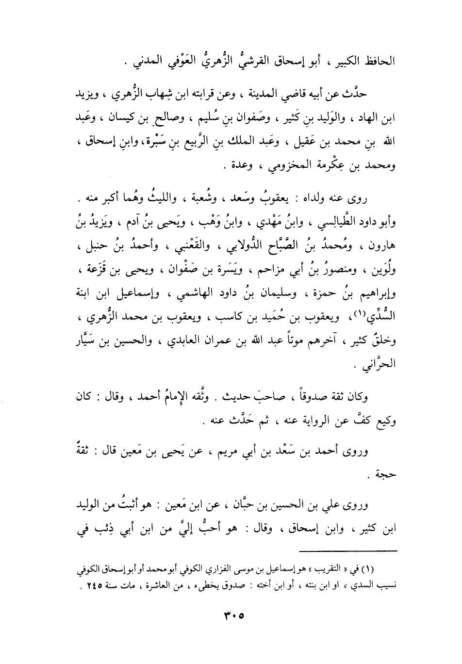 وَرَوَى: عَلِيُّ بنُ الحُسَيْنِ بنِ حِبَّانَ، عَنِ ابْنِ مَعِيْنٍ: هُوَ أَثْبَتُ مِنَ الوَلِيْدِ بنِ كَثِيْرٍ، وَابْنِ إِسْحَاقَ، وَقَالَ: هُوَ أَحَبُّ إِلَيَّ مِنِ ابْنِ أَبِي ذِئْبٍ فِي