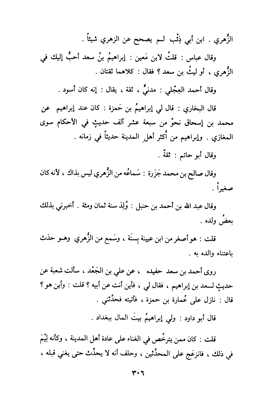 وَإِبْرَاهِيْمُ مِنْ أَكْثَرِ أَهْلِ المَدِيْنَةِ حَدِيْثاً فِي زَمَانِهِ.