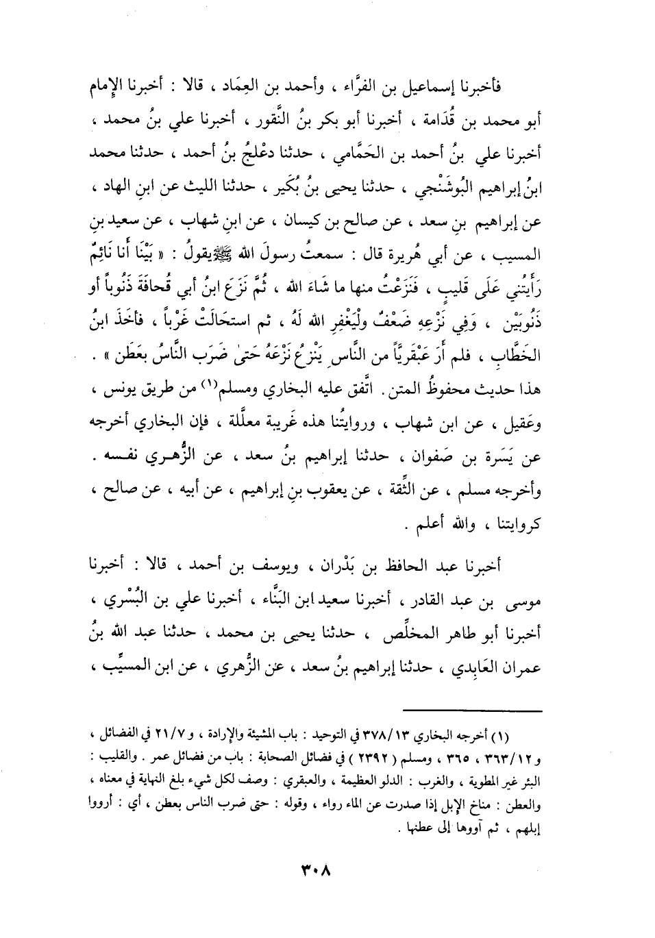 أَخْبَرَنَا الإِمَامُ، أَبُو مُحَمَّدٍ بنُ قُدَامَةَ، أَخْبَرَنَا أَبُو بَكْرٍ بنُ النَّقُّوْرِ، أَخْبَرَنَا عَلِيُّ بنُ مُحَمَّدٍ، أَخْبَرَنَا عَلِيُّ بنُ أَحْمَدَ بنِ الحَمَّامِيِّ، حَدَّثَنَا دَعْلَجُ بنُ أَحْمَدَ، حَدَّثَنَا مُحَمَّدُ بنُ إِبْرَاهِيْمَ البُوْشَنْجِيِّ، حَدَّثَنَا يَحْيَى بنُ بُكَيْرٍ، حَدَّثَنَا اللَّيْثُ عَنِ ابْنِ الهَادِ، عَنْ إِبْرَاهِيْمَ بنِ سَعْدٍ، عَنْ صَالِحِ بنِ كَيْسَانَ، عَنِ ابْنِ شِهَابٍ، عَنْ سَعِيْدِ بنِ المُسَيِّبِ، عَنْ أَبِي هُرَيْرَةَ قَالَ: