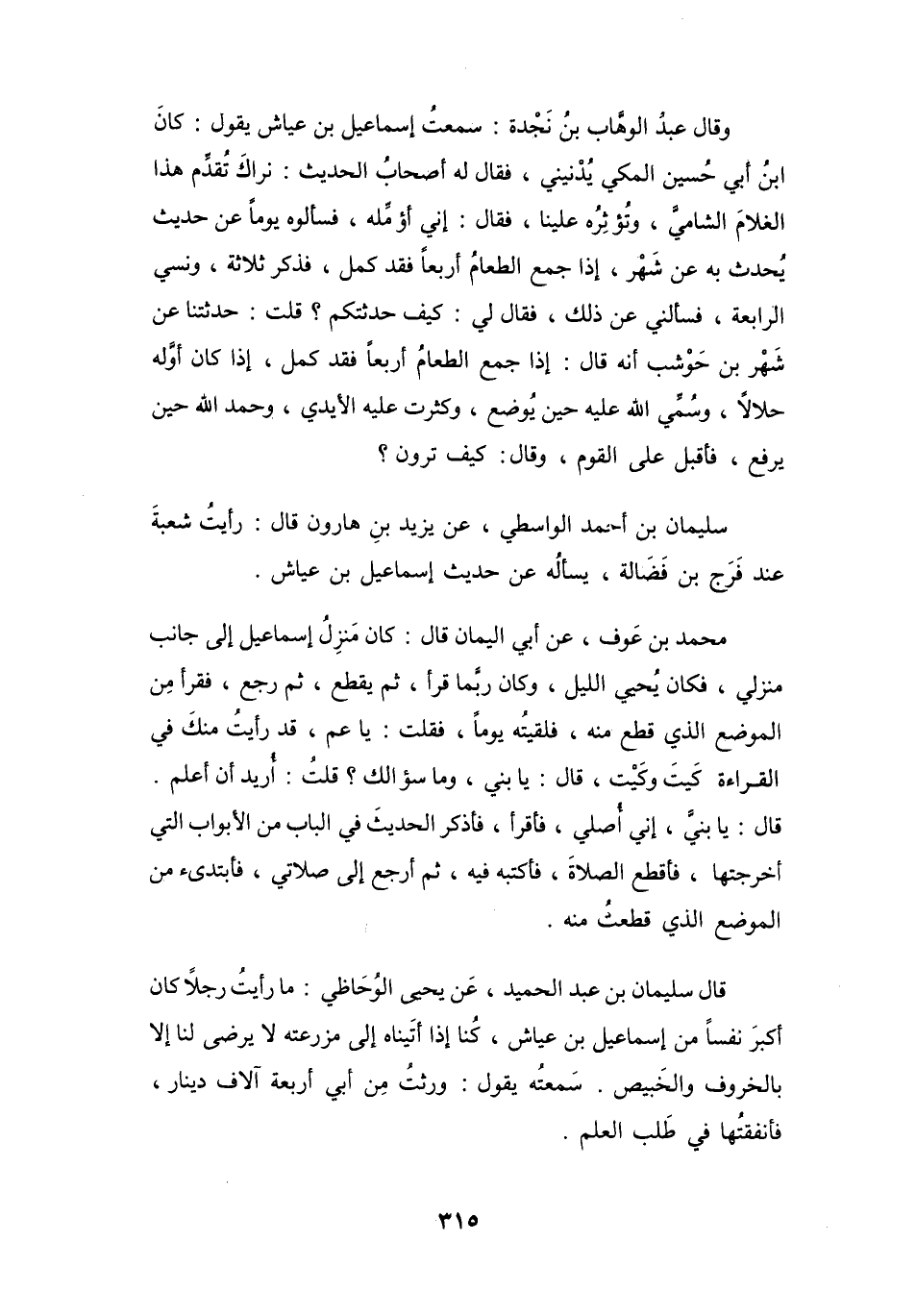 قَالَ سُلَيْمَانُ بنُ عَبْدِ الحَمِيْدِ عَنْ يَحْيَى الوُحَاظِيِّ: مَا رَأَيْتُ رَجُلاً كَانَ أَكْبَرَ نَفْساً مِنْ إِسْمَاعِيْلَ بنِ عَيَّاشٍ، كُنَّا إِذَا أَتَيْنَاهُ إِلَى مزرعَتِهِ لاَ يَرْضَى لَنَا إِلاَّ بِالخَرُوفِ وَالخبِيصِ.