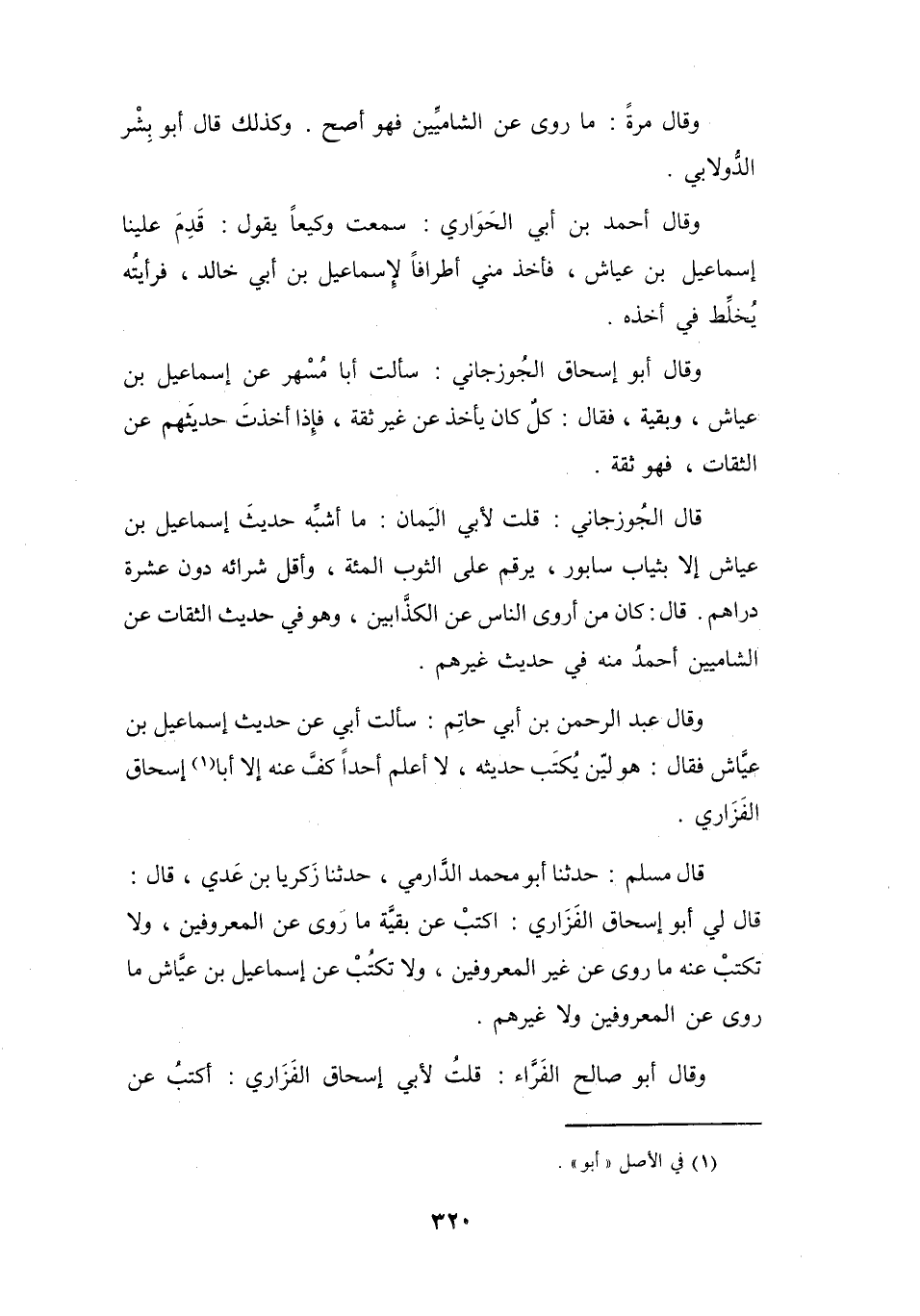 وَقَالَ عَبْدُ الرَّحْمَنِ بنُ أَبِي حَاتِمٍ: سَأَلْتُ أَبِي عَنْ حَدِيْثِ إِسْمَاعِيْلَ بنِ عَيَّاشٍ، فَقَالَ: هُوَ لَيِّنٌ، يُكتَبُ حَدِيْثُهُ، لاَ أَعْلَمُ أَحَداً كَفَّ عَنْهُ، إِلاَّ أَبَا (1) إِسْحَاقَ الفَزَارِيَّ.