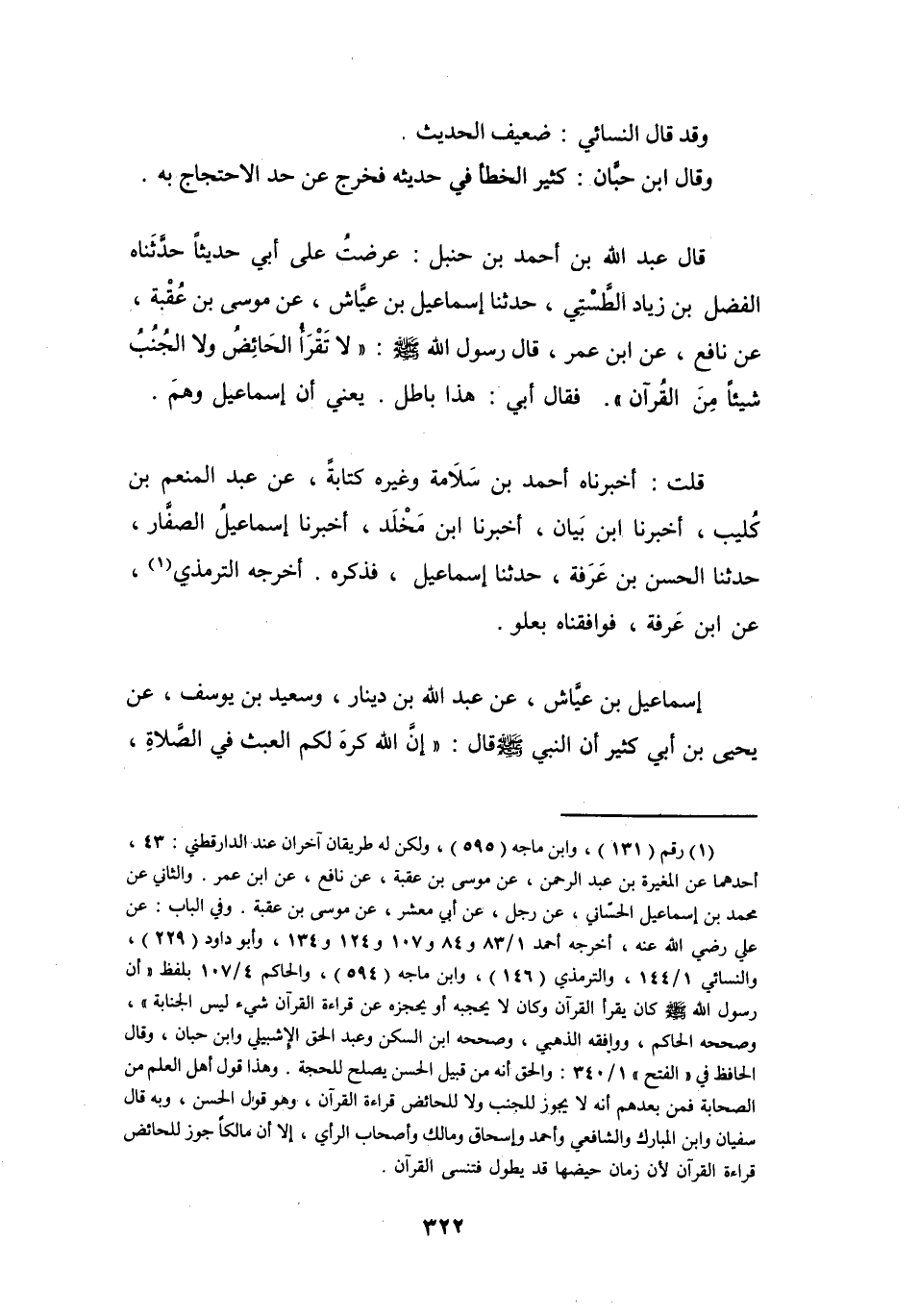 قَالَ عَبْدُ اللهِ بنُ أَحْمَدَ بنِ حَنْبَلٍ: عرضْتُ عَلَى أَبِي حَدِيْثاً حَدَّثَنَاهُ الفَضْلُ بنُ زِيَادٍ الطَّسْتِيُّ، حَدَّثَنَا إِسْمَاعِيْلُ بنُ عَيَّاشٍ، عَنْ مُوْسَى بنِ عُقْبَةَ، عَنْ نَافِعٍ، عَنِ ابْنِ عُمَرَ: