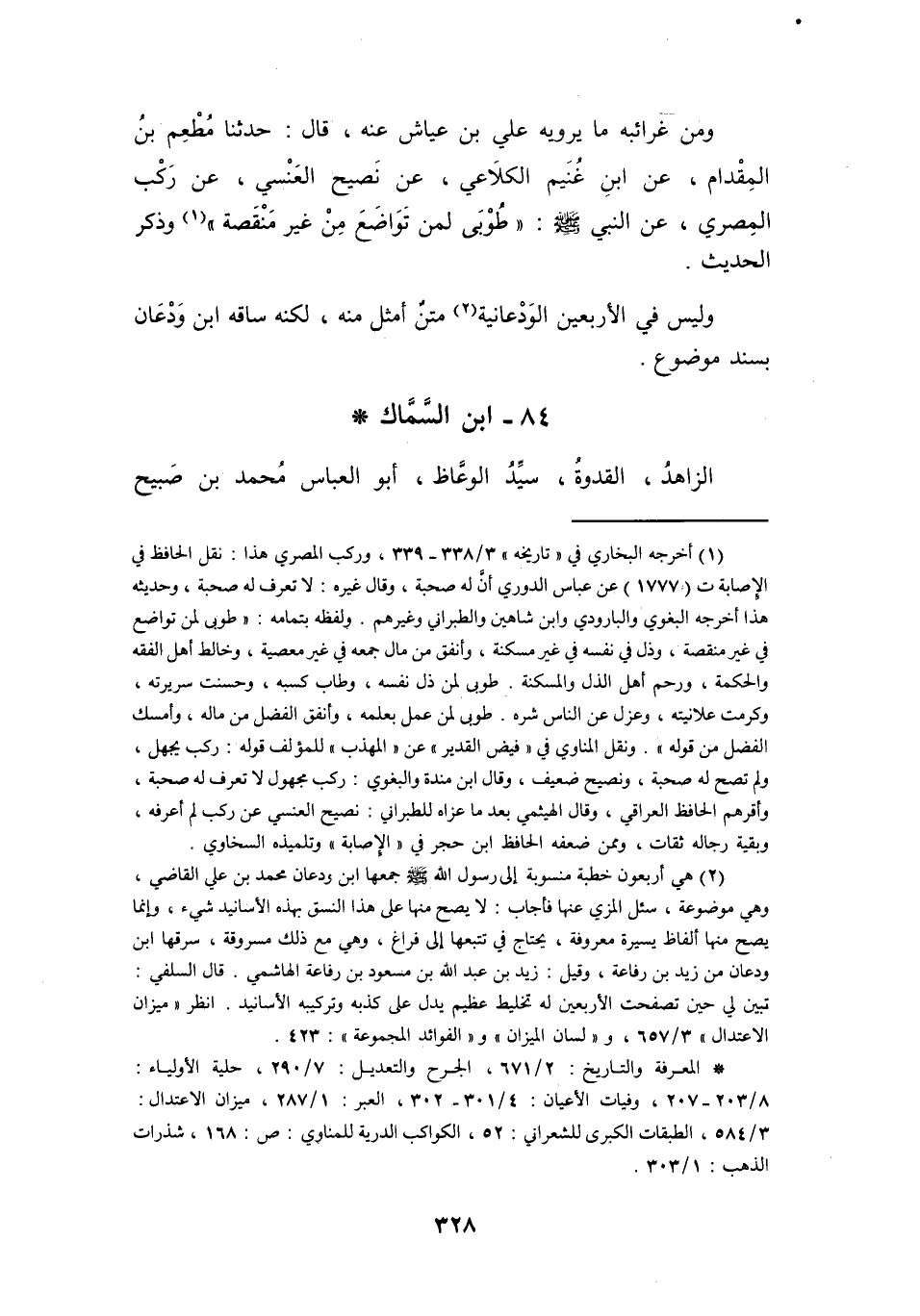 (2) هي أربعون خطبة منسوبة إلى رسول الله صلى الله عليه وسلم جمعها ابن ودعان محمد بن علي القاضي، وهي موضوعة، سئل المزي عنها فأجاب: لا يصح منها على هذا النسق بهذه الأسانيد شيء، وإنما يصح منها ألفاظ يسيرة معروفة، يحتاج في تتبعها إلى فراغ، وهي مع ذلك مسروقة، سرقها ابن ودعان من زيد بن رفاعة، وقيل: زيد بن عبد الله بن مسعود بن رفاعة الهاشمي.