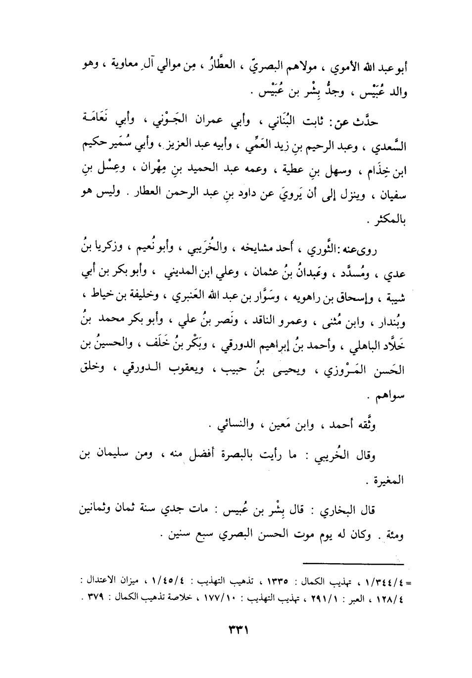 = 4 / 344 / 1، تهذيب الكمال: 1335، تذهيب التهذيب: 4 / 45 / 1، ميزان الاعتدال: 4 / 128، العبر: 1 / 291، تهذيب التهذيب: 10 / 177، خلاصة تذهيب الكمال: 379.