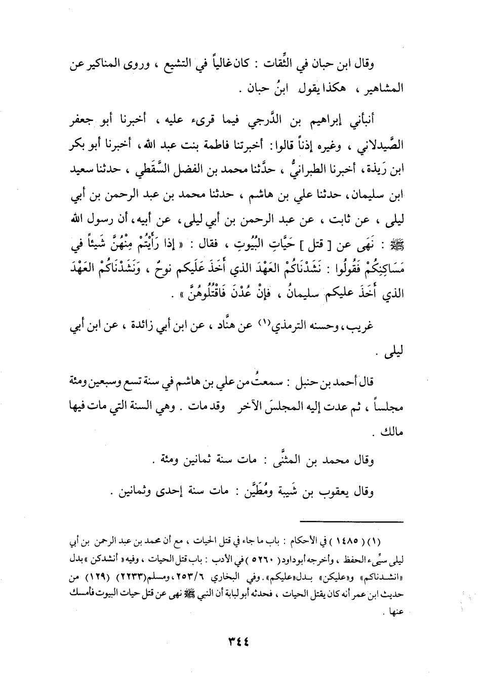 (1) (1485) في الاحكام: باب ما جاء في قتل الحيات، مع أن محمد بن عبد الرحمن بن أبي ليلى سيئ الحفظ، وأخرجه أبو داود (5260) في الأدب: باب قتل الحيات، وفيه " أنشدكن " بدل " أنشدناكم " و" عليكن " بدل " عليكم ".