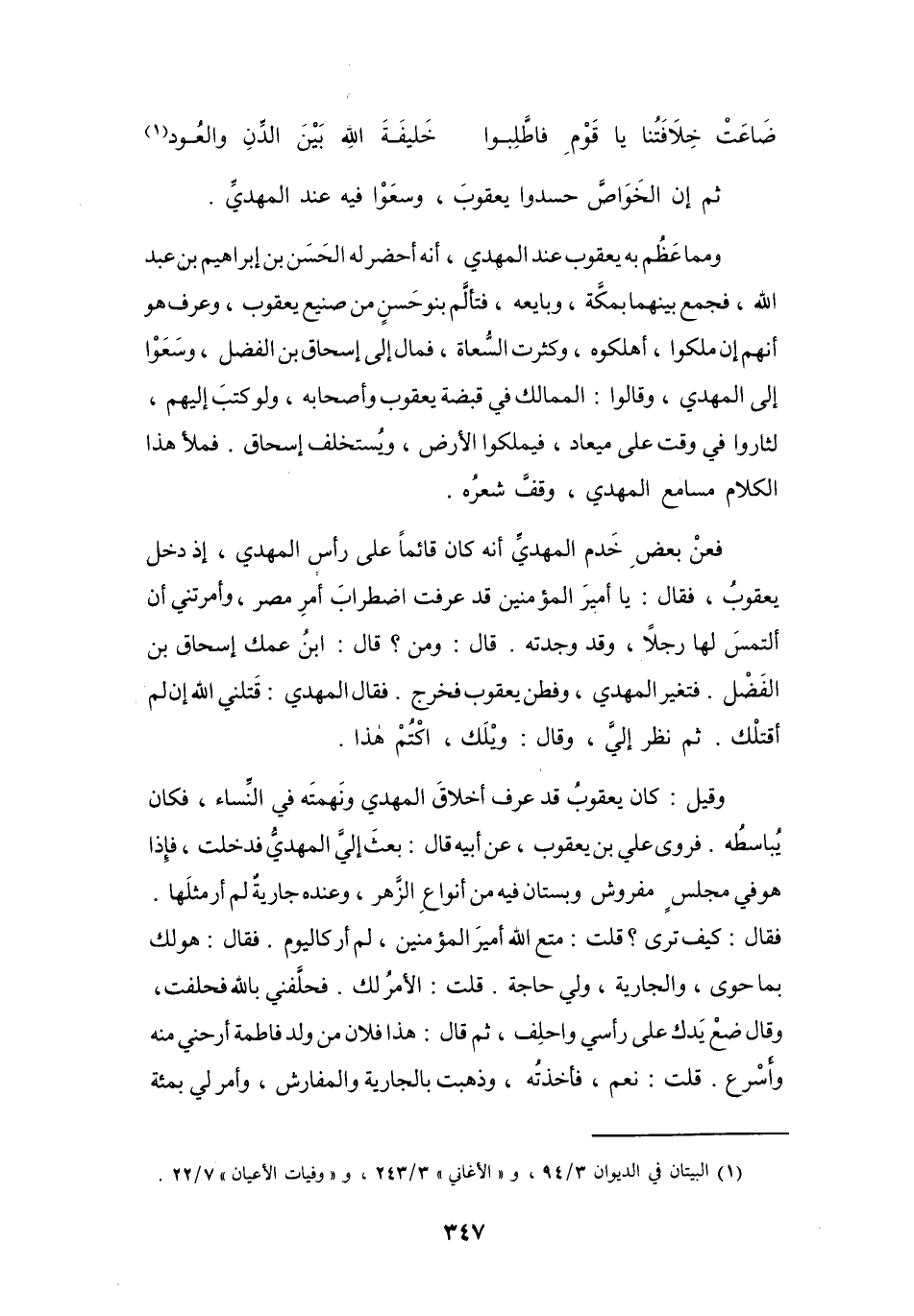 فَتَغَيَّرَ المَهْدِيُّ، وَفَطِنَ يَعْقُوْبُ، فَخَرَجَ، فَقَالَ المَهْدِيُّ: قَتَلَنِي اللهُ إِنْ لَمْ أَقْتُلْكَ.