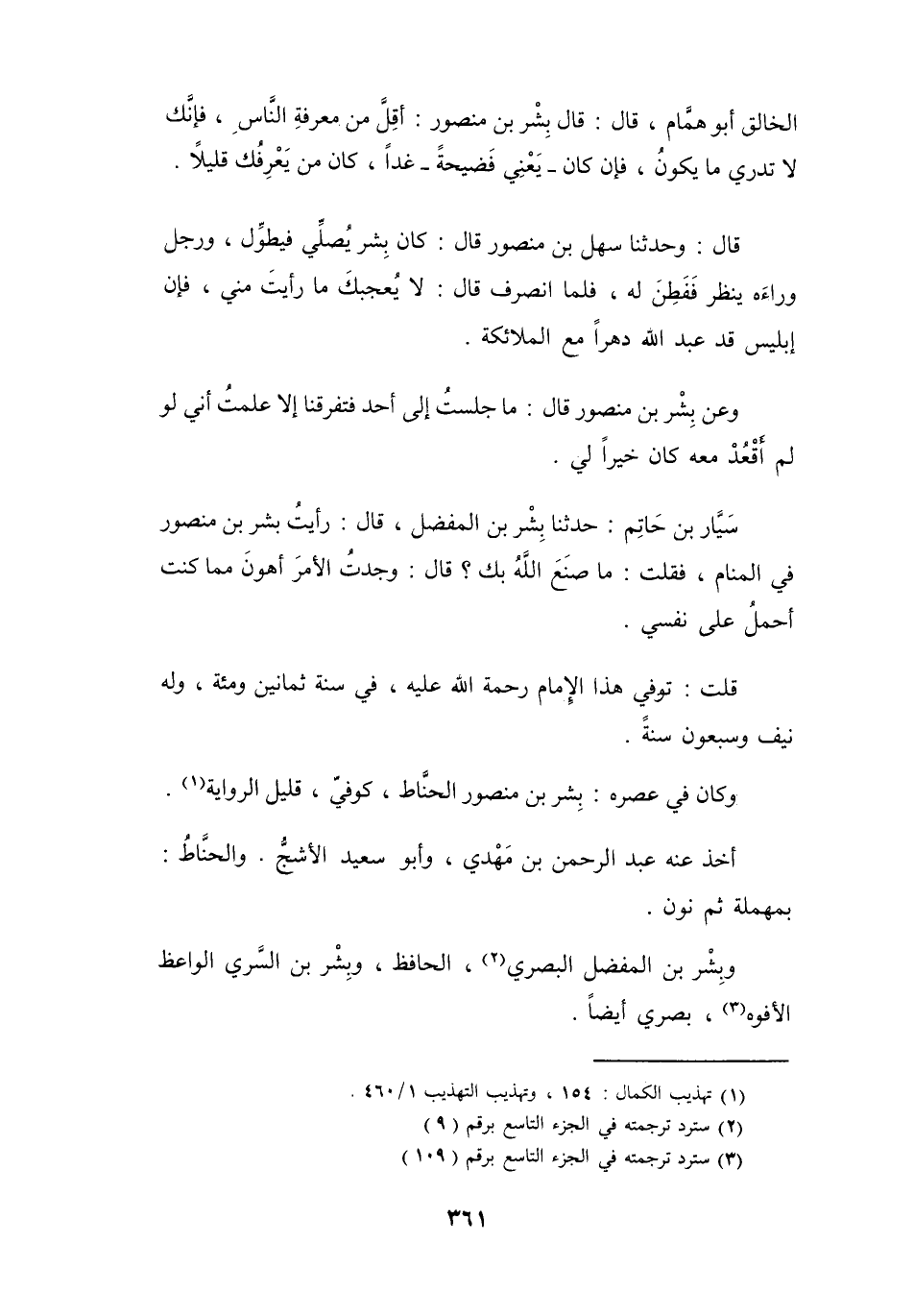 وَعَنْ بِشْرِ بنِ مَنْصُوْرٍ، قَالَ: مَا جَلَسْتُ إِلَى أَحَدٍ فَتَفَرَّقْنَا، إِلاَّ عَلِمتُ أَنِّي لَوْ لَمْ أَقْعُدْ مَعَهُ، كَانَ خَيْراً لِي.
