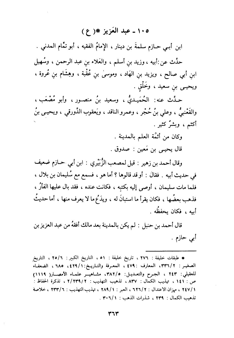 105 - عَبْدُ العَزِيْزِ بنُ أَبِي حَازِمٍ سَلَمَةَ بنِ دِيْنَارٍ المَدَنِيُّ * (ع)