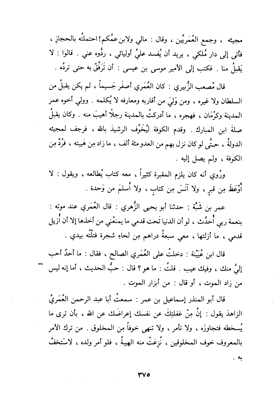 قَالَ مُصْعَبٌ الزُّبَيْرِيُّ: كَانَ العُمَرِيُّ أَصْفَرَ، جسِيْماً، لَمْ يَكُنْ يَقْبَلُ مِنَ السُّلْطَانِ وَلاَ غَيْرِهِ، وَمَنْ وَلِيَ مِنْ أَقَارِبِهِ وَمَعَارِفِهِ لاَ يُكَلِّمُهُ، وَوَلِيَ أَخُوْهُ عُمَرُ المَدِيْنَةَ وَكرمَانَ، فَهَجَرَهُ، مَا أَدْرَكتُ بِالمَدِيْنَةِ رَجُلاً أَهْيَبَ مِنْهُ، وَكَانَ يَقْبَلُ صِلَةَ ابْنِ المُبَارَكِ.