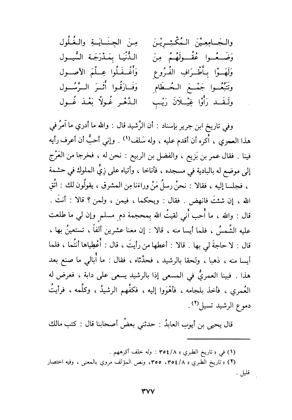 وَفِي (تَارِيْخِ ابْنِ جَرِيْرٍ) بِإِسْنَادٍ: أَنَّ الرَّشِيْدَ قَالَ: وَاللهِ مَا أَدْرِي مَا آمرُ فِي هَذَا العُمَرِيِّ، أَكرَهُ أَنْ أَقدَمَ عَلَيْهِ، وَلَهُ سلَفٌ (1) ، وَإِنِّيْ أُحِبُّ أَنْ أَعْرِفَ رَأْيَهُ فِيْنَا.