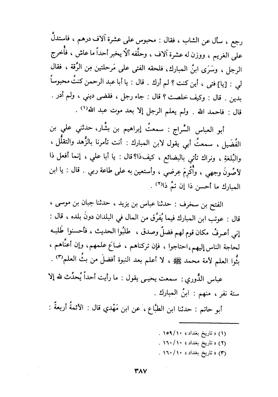 أَبُو العَبَّاسِ السَّرَّاجُ: سَمِعْتُ إِبْرَاهِيْمَ بنَ بَشَّارٍ، حَدَّثَنِي عَلِيُّ بنُ الفُضَيْلِ، سَمِعْتُ أَبِي يَقُوْلُ لابْنِ المُبَارَكِ: