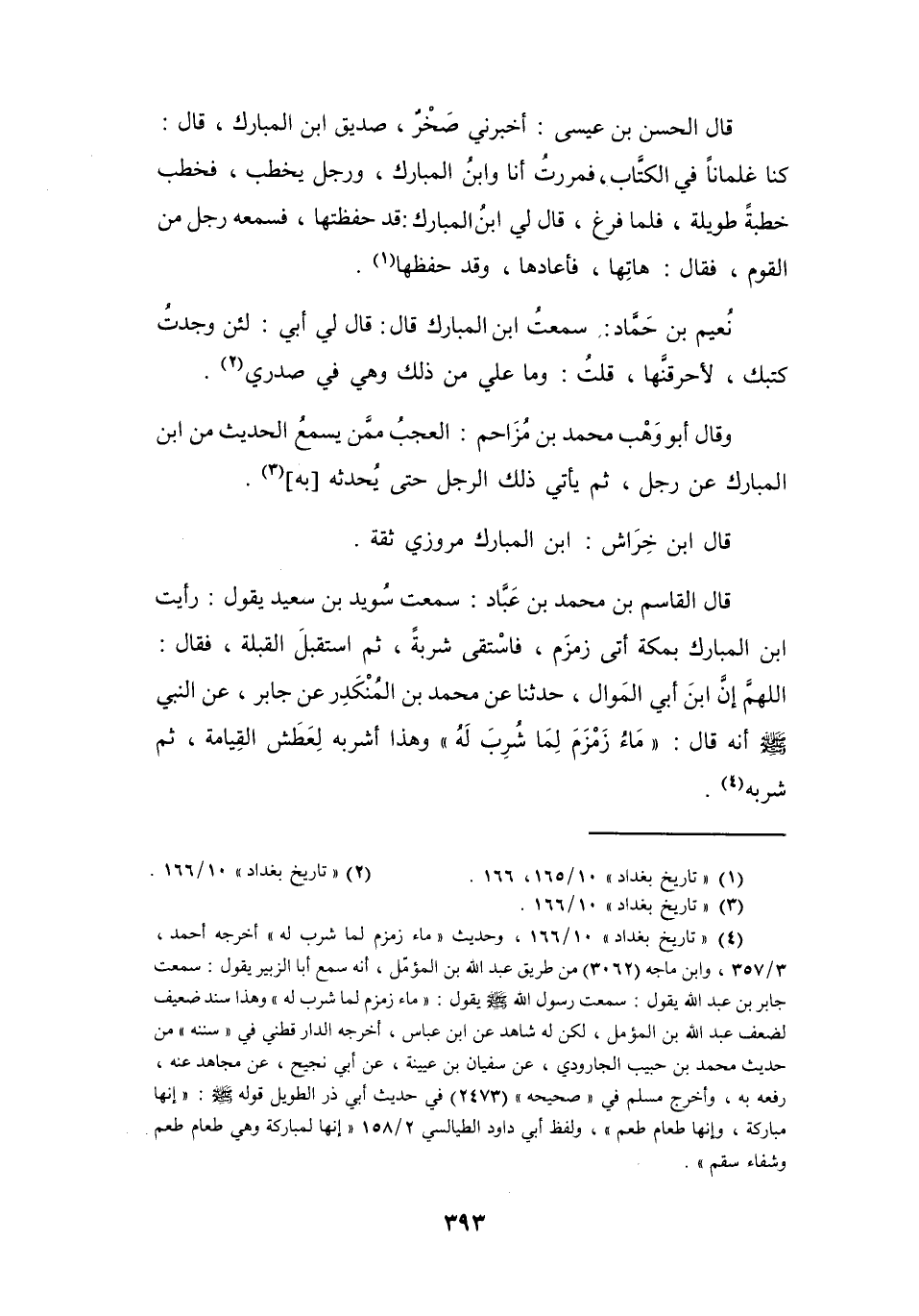 (4) " تاريخ بغداد " 10 / 166، وحديث " ماء زمزم لما شرب له " أخرجه أحمد، 3 / 357، وابن ماجه (3062) من طريق عبد الله بن المؤمل، أنه سمع أبا الزبير يقول: سمعت جابر بن عبد الله يقول: سمعت رسول الله صلى الله عليه وسلم يقول: " ماء زمزم لما شرب له " وهذا سند ضعيف لضعف عبد الله بن المؤمل، لكن له شاهد عن ابن عباس، أخرجه الدارقطني في " سننه " من حديث محمد بن حبيب الجارودي، عن سفيان بن عيينة، عن أبي نجيح، عن مجاهد عنه، رفعه به، وأخرجه مسلم في " صحيحه " (2473) في حديث أبي ذر الطويل قوله صلى الله عليه وسلم: " إنها مباركة، وإنها طعام طعم "، ولفظ أبي داود الطيالسي 2 / 158 " إنها لمباركة وهي طعام طعم وشفاء سقم ".