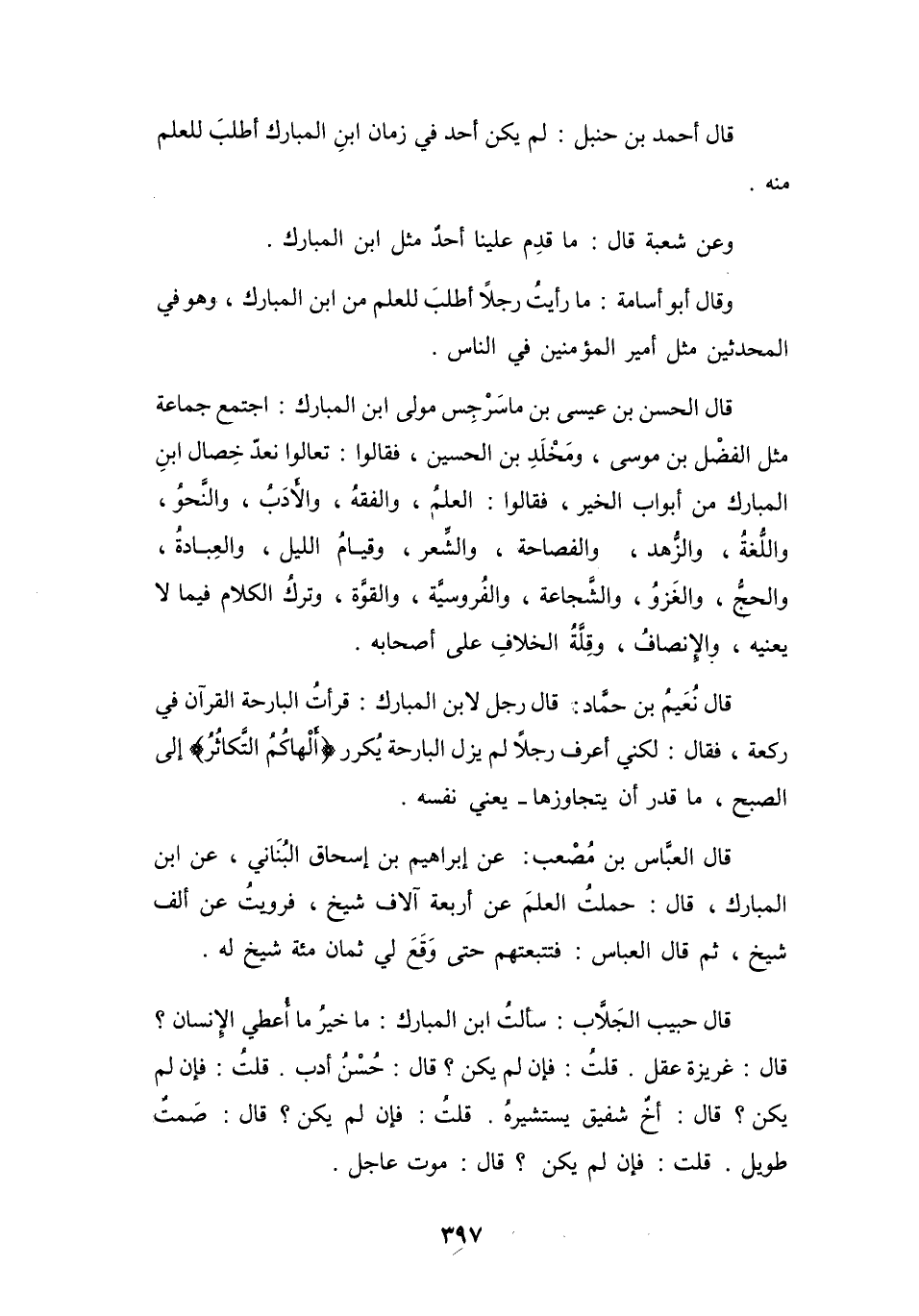 تَعَالَوْا نَعُدُّ خِصَالَ ابْنِ المُبَارَكِ مِنْ أَبْوَابِ الخَيْرِ، فَقَالُوا: العِلْمُ، وَالفِقْهُ، وَالأَدَبُ، وَالنَّحْوُ، وَاللُّغَةُ، وَالزُّهْدُ، وَالفَصَاحَةُ، وَالشِّعْرُ، وَقِيَامُ اللَّيْلِ، وَالعِبَادَةُ، وَالحَجُّ، وَالغَزْوُ، وَالشَّجَاعَةُ، وَالفُرُوْسِيَّةُ، وَالقُوَّةُ، وَتَرْكُ الكَلاَمِ فِيْمَا لاَ يَعْنِيْهِ، وَالإِنصَافُ، وَقِلَّةُ الخِلاَفِ عَلَى أَصْحَابِهِ.