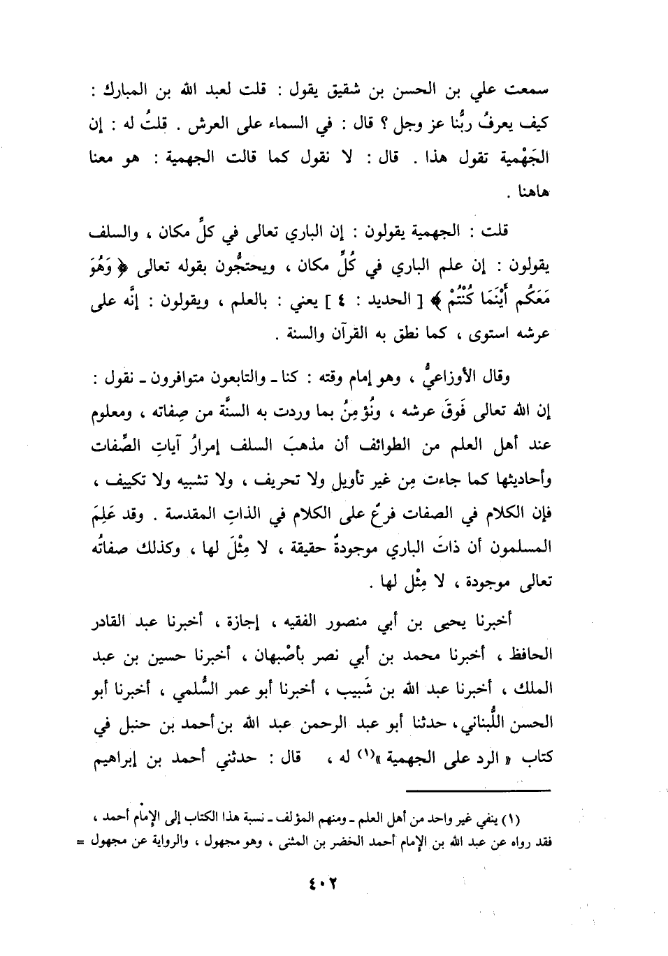 أَخْبَرَنَا يَحْيَى بنُ أَبِي مَنْصُوْرٍ الفَقِيْهُ إِجَازَةً، أَخْبَرَنَا عَبْدُ القَادِرِ الحَافِظُ، أَخْبَرَنَا مُحَمَّدُ بنُ أَبِي نَصْرٍ بِأَصْبَهَانَ، أَخْبَرَنَا حُسَيْنُ بنُ عَبْدِ المَلِكِ، أَخْبَرَنَا عَبْدُ اللهِ بنُ شَبِيْبٍ، أَخْبَرَنَا أَبُو عُمَرَ السُّلَمِيُّ، أَخْبَرَنَا أَبُو الحَسَنِ اللُّبْنَانِيُّ، حَدَّثَنَا أَبُو عَبْدِ الرَّحْمَنِ عَبْدُ اللهِ بنُ أَحْمَدَ بنِ حَنْبَلٍ فِي كِتَابِ (الرَّدِّ عَلَى الجَهْمِيَّةِ (1)) لَهُ، قَالَ: حَدَّثَنِي أَحْمَدُ بنُ إِبْرَاهِيْمَ
