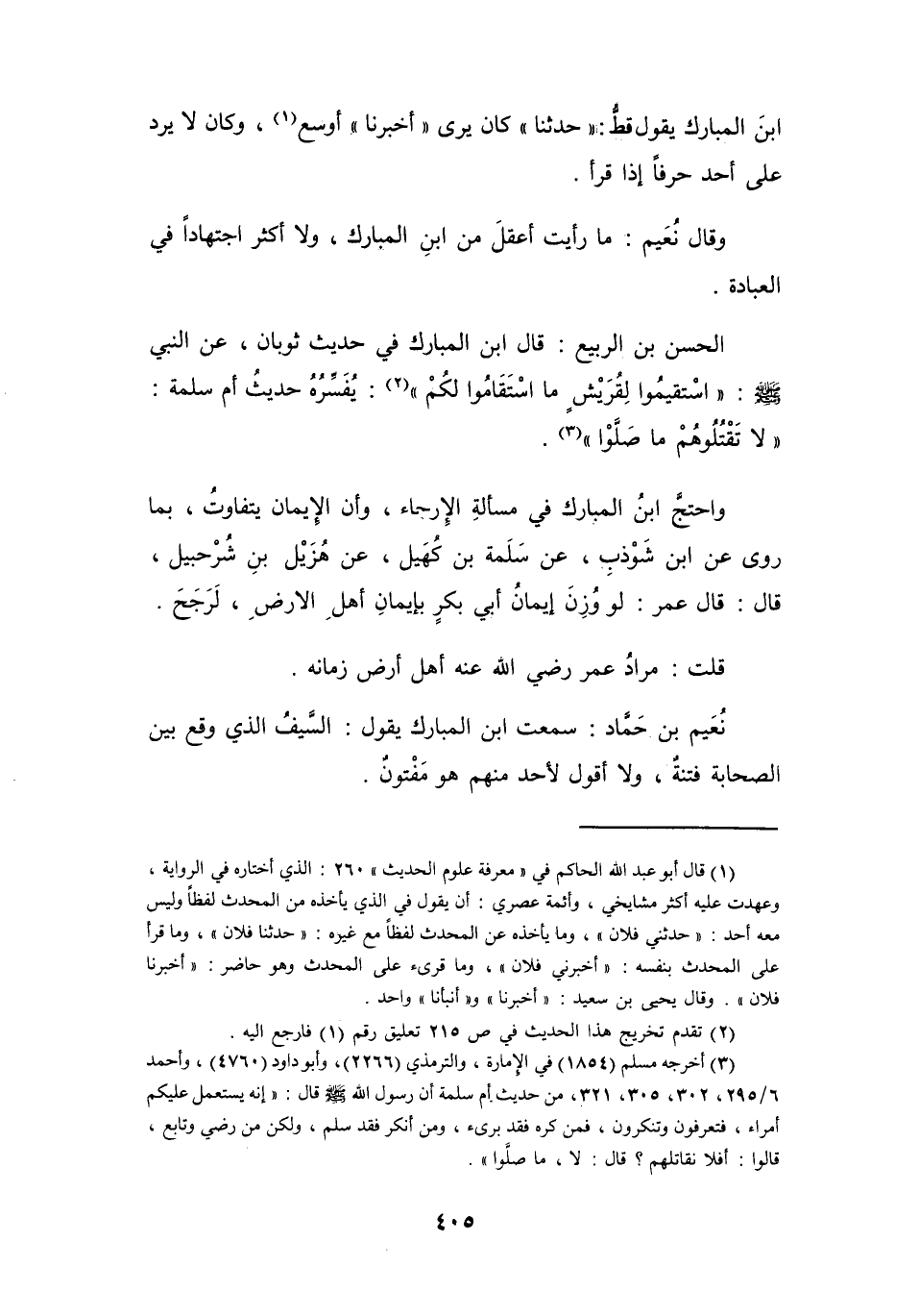 ابْنَ المُبَارَكِ يَقُوْلُ قَطُّ: (حَدَّثَنَا) ، كَانَ يَرَى (أَخْبَرَنَا) أَوْسَعَ (1) ، وَكَانَ لاَ يَرُدُّ عَلَى أَحَدٍ حَرفاً إِذَا قَرَأَ.