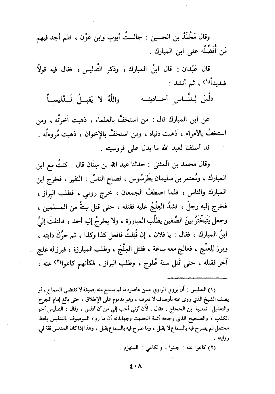 عَنِ ابْنِ المُبَارَكِ، قَالَ: مَنِ اسْتَخَفَّ بِالعُلَمَاءِ، ذَهَبتْ آخِرَتُهُ، وَمَنِ اسْتَخَفَّ بِالأُمَرَاءِ، ذَهَبتْ دُنْيَاهُ، وَمَنِ اسْتَخَفَّ بِالإِخْوَانِ، ذَهَبتْ مُرُوءتُهُ.