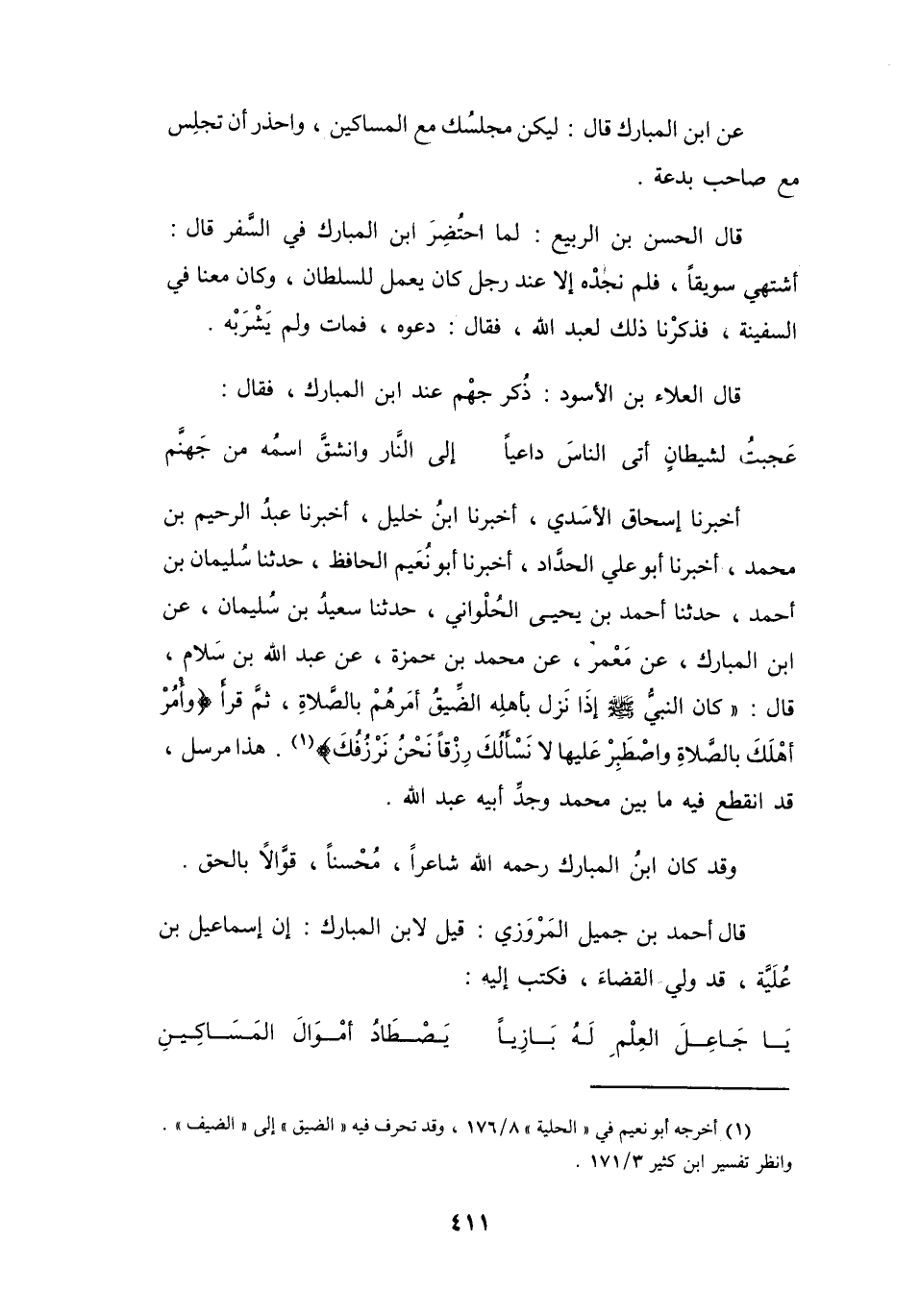 عَنِ ابْنِ المُبَارَكِ، قَالَ: لِيَكُنْ مَجْلِسُكَ مَعَ المَسَاكِيْنِ، وَاحْذَرْ أَنْ تَجلِسَ مَعَ صَاحِبِ بِدْعَةٍ.