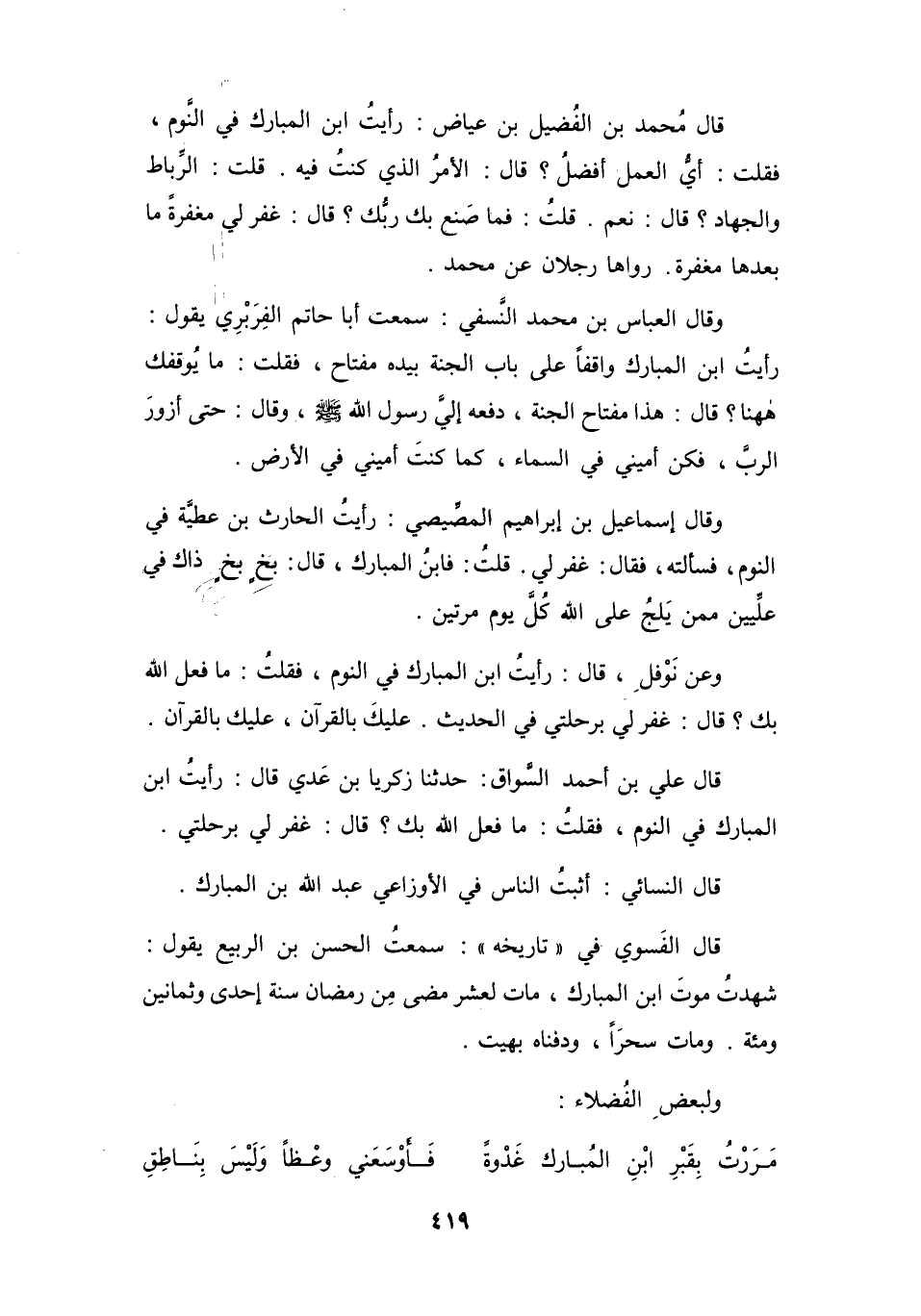 رَأَيْتُ ابْنَ المُبَارَكِ فِي النَّوْمِ، فَقُلْتُ: مَا فَعَلَ اللهُ بِكَ؟