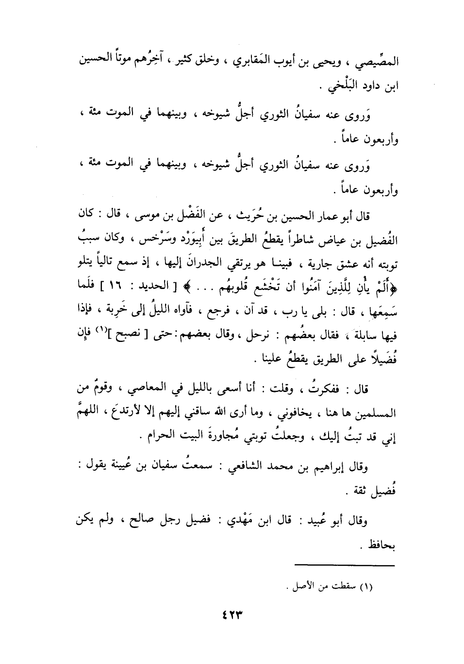 كَانَ الفُضَيْلُ بنُ عِيَاضٍ شَاطِراً يَقْطَعُ الطَّرِيْقَ بَيْنَ أَبِيْوَرْدَ وَسَرْخَسَ، وَكَانَ سَبَبُ تَوْبَتِهِ أَنَّهُ عَشِقَ جَارِيَةً، فَبَيْنَا هُوَ يَرْتَقِي الجُدْرَانَ إِلَيْهَا، إِذْ سَمِعَ تَالِياً يَتْلُو: {أَلَمْ يَأْنِ لِلَّذِيْنَ آمَنُوا أَنْ تَخْشَعَ قُلُوْبُهُم ... } [الحَدِيْدُ: 16] . فَلَمَّا سَمِعَهَا، قَالَ: بَلَى يَا رَبِّ، قَدْ آنَ.