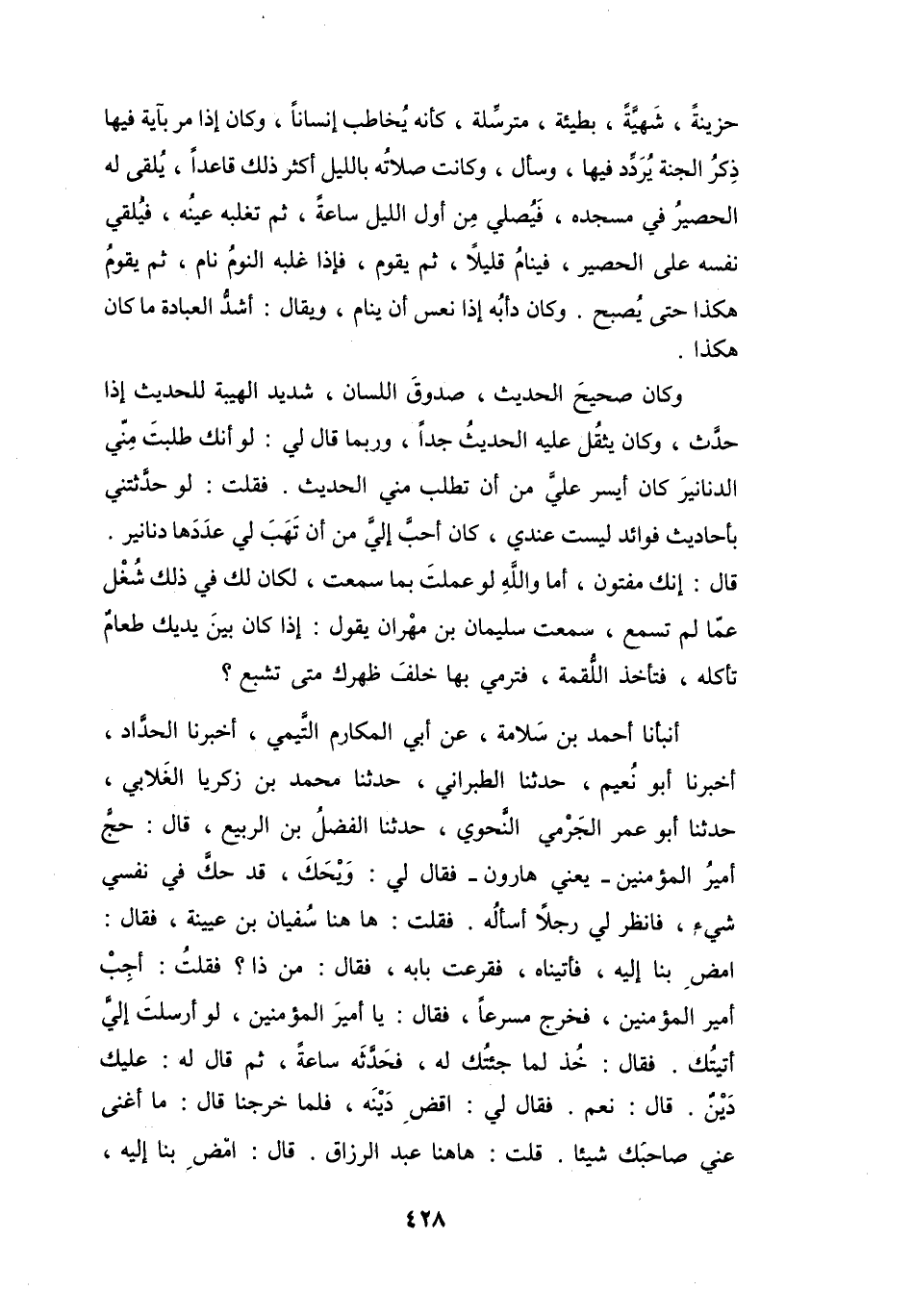 حَزِيْنَةً، شَهِيَّةً، بَطِيئَةً، مُتَرسِّلَةً، كَأَنَّهُ يُخَاطِبُ إِنْسَاناً، وَكَانَ إِذَا مَرَّ بِآيَةٍ فِيْهَا ذِكْرُ الجَنَّةِ، يُرَدِّدُ فِيْهَا، وَسَأَلَ، وَكَانَتْ صَلاَتُهُ بِاللَّيْلِ أَكْثَرُ ذَلِكَ قَاعِداً، يُلْقَى لَهُ الحَصِيْرُ فِي مَسْجِدِهِ، فَيُصَلِّي فِي أَوَّلِ اللَّيْلِ سَاعَةً، ثُمَّ تَغْلِبُهُ عَيْنُهُ، فَيُلْقِي نَفْسَهُ عَلَى الحَصِيْرِ، فَيَنَامُ قَلِيْلاً، ثُمَّ يَقُوْمُ، فَإِذَا غَلَبَهُ النَّوْمُ، نَامُ، ثُمَّ يَقُوْمُ، هَكَذَا حَتَّى يُصْبِحَ، وَكَانَ دَأْبُهُ إِذَا نَعِسَ أَنْ يَنَامَ، وَيُقَالُ: أَشَدُّ العِبَادَةِ مَا كَانَ هَكَذَا.