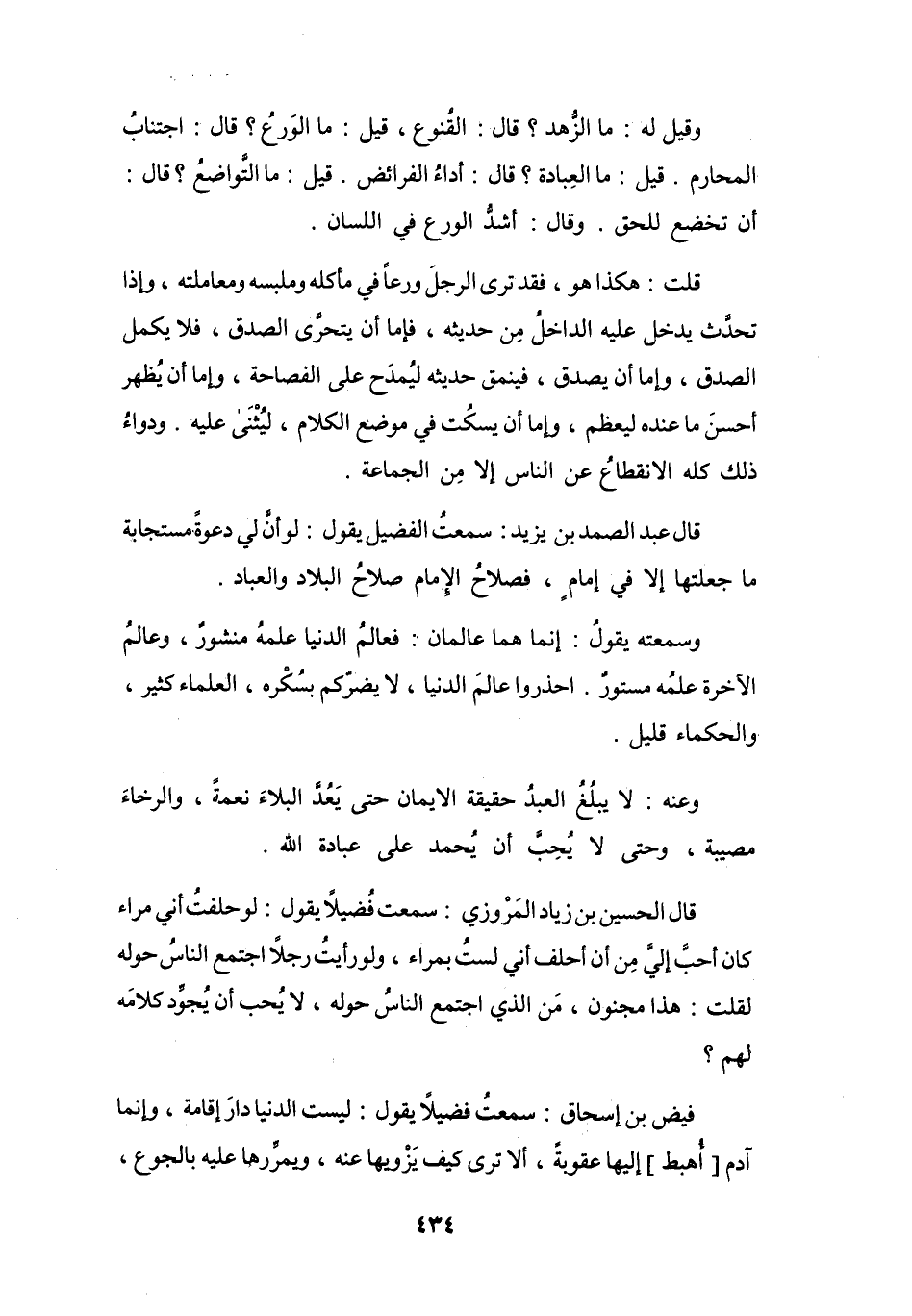 قَالَ الحُسَيْنُ بنُ زِيَادٍ المَرْوَزِيُّ: سَمِعْتُ فُضَيْلاً يَقُوْلُ: