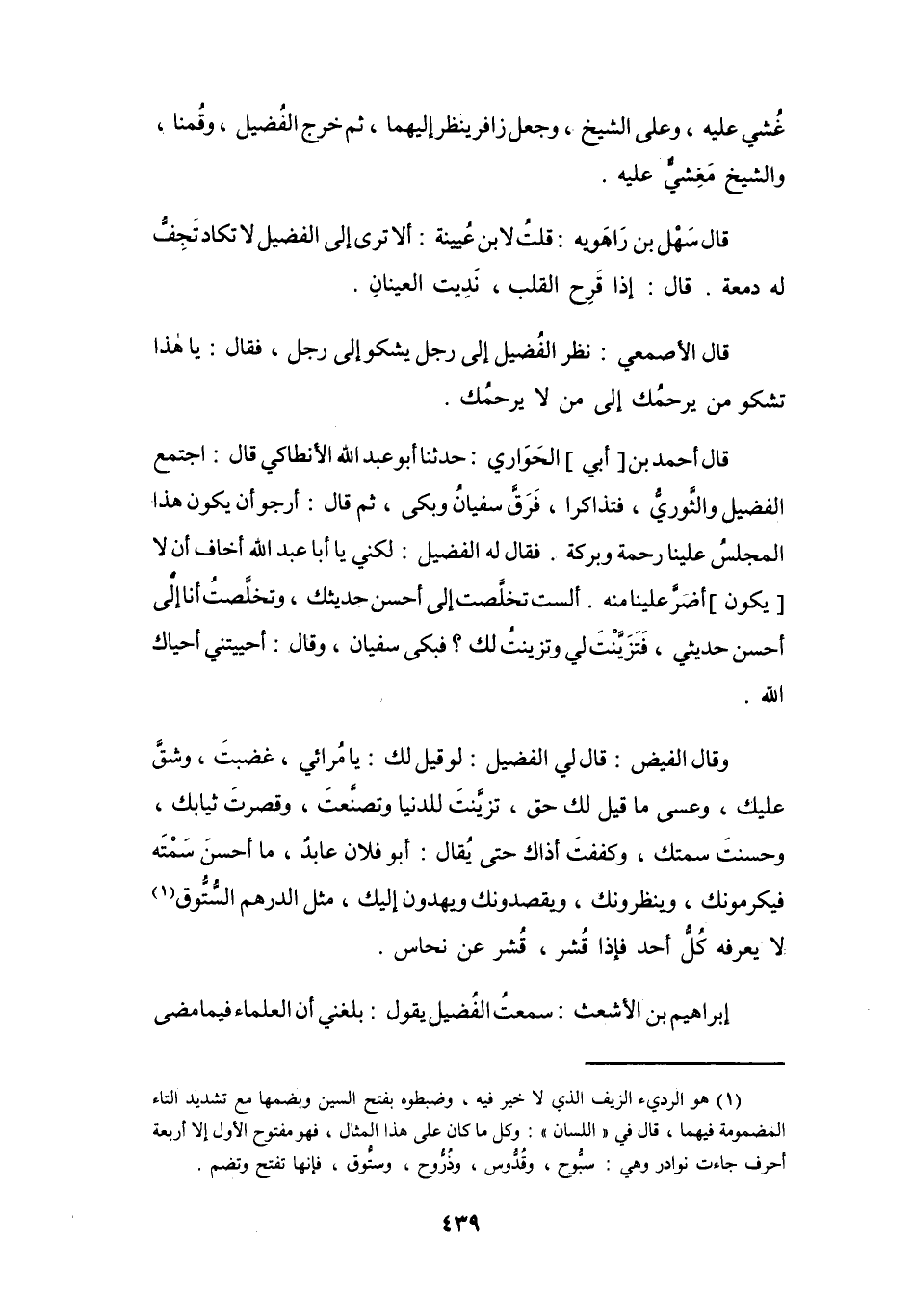 فَقَالَ لَهُ الفُضَيْلُ: لَكِنِّي يَا أَبَا عَبْدِ اللهِ، أَخَافُ أَنْ لاَ يَكُوْنَ أَضَرَّ عَلَيْنَا مِنْهُ، أَلَسْتَ تَخَلَّصْتَ إِلَى أَحْسَنِ حَدِيْثِكَ، وَتَخَلَّصْتُ أَنَا إِلَى أَحْسَنِ حَدِيْثِي، فَتَزَيَّنْتَ لِي، وَتَزَيَّنْتُ لَكَ؟