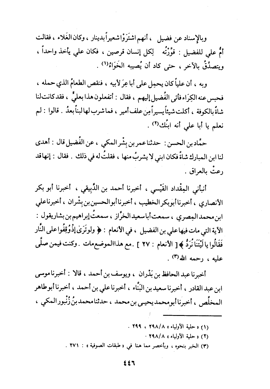 حَمَّادُ بنُ الحَسَنِ: حَدَّثَنَا عُمَرُ بنُ بِشْرٍ المَكِّيُّ، عَنِ الفُضَيْلِ قَالَ: أَهدَى لَنَا ابْنُ المُبَارَكِ شَاةً، فَكَانَ ابْنِي لاَ يَشْرَبُ مِنْهَا، فَقُلْتُ لَهُ فِي ذَلِكَ، فَقَالَ: إِنَّهَا قَدْ رَعَتْ بِالعِرَاقِ.