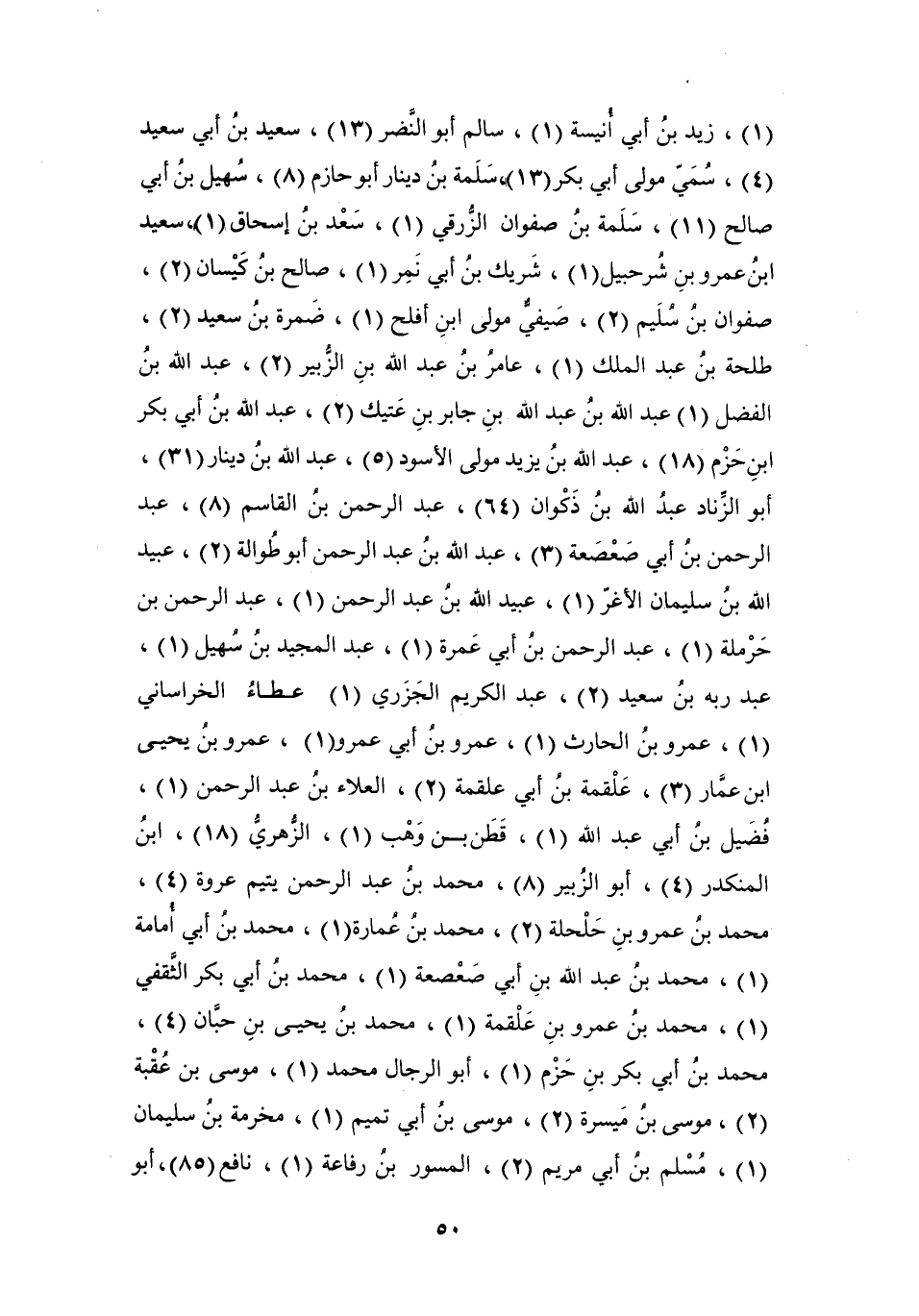 زَيْدُ بنُ أَبِي أُنَيْسَةَ (1) ، سَالِمٌ أَبُو النَّضْرِ (13) ، سَعِيْدُ بنُ أَبِي سَعِيْدٍ (4) ، سُمَيٌّ مَوْلَى أَبِي بَكْرٍ (13) ، سَلَمَةُ بنُ دِيْنَارٍ أَبُو حَازِمٍ (8) ، سُهَيْلُ بنُ أَبِي صَالِحٍ (11) ، سَلَمَةُ بنُ صَفْوَانَ الزُّرَقِيُّ (1) ، سَعْدُ بنُ إِسْحَاقَ (1) ، سَعِيْدُ بنُ عَمْرِو بنِ شُرَحْبِيْلَ (1) ، شَرِيْكُ بنُ أَبِي نَمِرٍ (1) ، صَالِحُ بنُ كَيْسَانَ (2) ، صَفْوَانُ بنُ سُلَيْمٍ (2) ، صَيْفِيٌّ مَوْلَى ابْنِ أَفْلَحَ (1) ، ضَمْرَةُ بنُ سَعِيْدٍ (2) ، طَلْحَةُ بنُ عَبْدِ المَلِكِ (1) ، عَامِرُ بنُ عَبْدِ اللهِ بنِ الزُّبَيْرِ (2) ، عَبْدُ اللهِ بنُ الفَضْلِ (1) ، عَبْدُ اللهِ بنُ عَبْدِ اللهِ بنِ جَابِرِ بنِ عَتِيْكٍ (2) ، عَبْدُ اللهِ بنُ أَبِي بَكْرٍ بنِ حَزْمٍ (18) ، عَبْدُ اللهِ بنُ يَزِيْدَ مَوْلَى الأَسْوَدِ (5) ، عَبْدُ اللهِ بنُ دِيْنَارٍ (31) ، أَبُو الزِّنَادِ عَبْدُ اللهِ بنُ ذَكْوَانَ (64) ، عَبْدُ الرَّحْمَنِ بنُ القَاسِمِ (8) ، عَبْدُ الرَّحْمَنِ بنُ أَبِي صَعْصَعَةَ (3) ، عَبْدُ اللهِ بنُ عَبْدِ الرَّحْمَنِ أَبُو طُوَالَةَ (2) ، عُبَيْدُ اللهِ بنُ سُلَيْمَانَ الأَغَرُّ (1) ، عُبَيْدُ اللهِ بنُ عَبْدِ الرَّحْمَنِ (1) ، عَبْدُ الرَّحْمَنِ بنُ حَرْملَةَ (1) ، عَبْدُ الرَّحْمَنِ بنُ أَبِي عَمْرَةَ (1) ، عَبْدُ المَجِيْدِ بنُ سُهَيْلٍ (1) ، عَبْدُ رَبِّهِ بنُ سَعِيْدٍ (2) ، عَبْدُ الكَرِيْمِ الجَزَرِيُّ (1) ، عَطَاءٌ الخُرَاسَانِيُّ (1) ، عَمْرُو بنُ الحَارِثِ (1) ، عَمْرُو بنُ أَبِي عَمْرٍو (1) ، عَمْرُو بنُ يَحْيَى بنِ عَمَّارٍ (3) ، عَلْقَمَةُ بنُ أَبِي عَلْقَمَةَ (2) ، العَلاَءُ بنُ عَبْدِ الرَّحْمَنِ (1) ، فُضَيْلُ بنُ أَبِي عَبْدِ اللهِ (1) ، قَطَنُ بنُ وَهْبٍ (1) ، الزُّهْرِيُّ (18) ، ابْنُ المُنْكَدِرِ (4) ، أَبُو الزُّبَيْرِ (8) ، مُحَمَّدُ بنُ عَبْدِ الرَّحْمَنِ يَتِيْمُ عُرْوَةَ (4) ، مُحَمَّدُ بنُ عَمْرِو بنِ حَلْحَلَةَ (2) ، مُحَمَّدُ بنُ عُمَارَةَ (1) ، مُحَمَّدُ بنُ أَبِي أُمَامَةَ (1) ، مُحَمَّدُ بنُ عَبْدِ اللهِ بنِ أَبِي صَعْصَعَةَ (1) ، مُحَمَّدُ بنُ أَبِي بَكْرٍ الثَّقَفِيُّ (1) ، مُحَمَّدُ بنُ عَمْرِو بنِ عَلْقَمَةَ (1) ، مُحَمَّدُ بنُ يَحْيَى بنِ حَبَّانَ (4) ، مُحَمَّدُ بنُ أَبِي بَكْرٍ بنِ حَزْمٍ (1) ، أَبُو الرِّجَالِ مُحَمَّدٌ (1) ، مُوْسَى بنُ عُقْبَةَ (2) ، مُوْسَى بنُ مَيْسَرَةَ (2) ، مُوْسَى بنُ أَبِي تَمِيْمٍ (1) ، مَخْرَمَةُ بنُ سُلَيْمَانَ (1) ، مُسْلِمُ بنُ أَبِي مَرْيَمَ (2) ، المِسْوَرُ بنُ رِفَاعَةَ (1) ، نَافِعٌ (85) ، أَبُو
